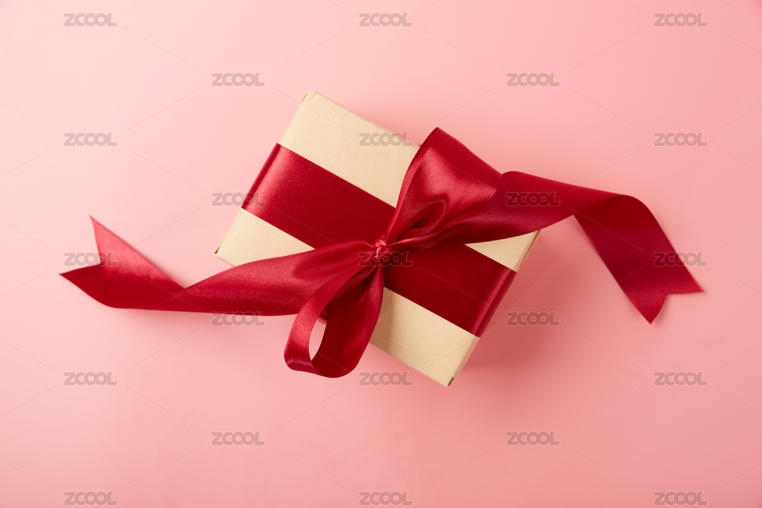 一个粉色礼盒带着蝴蝶结在红色背景上