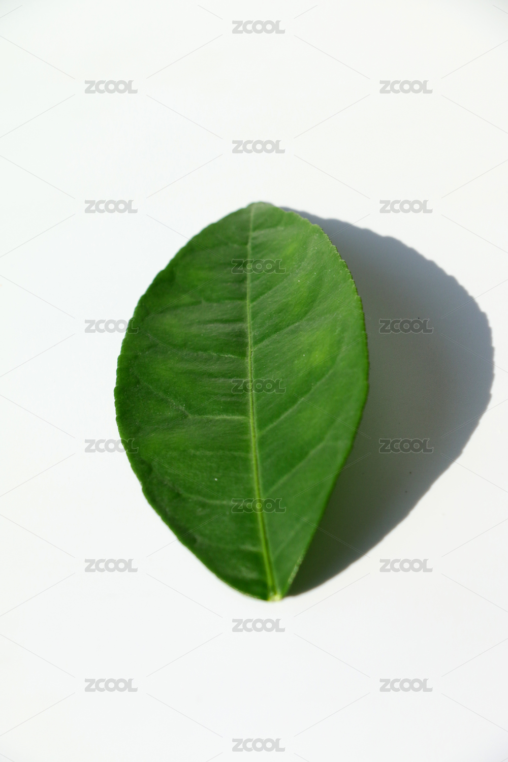 室内白色背景中一片侧放椭圆形绿色叶子特写