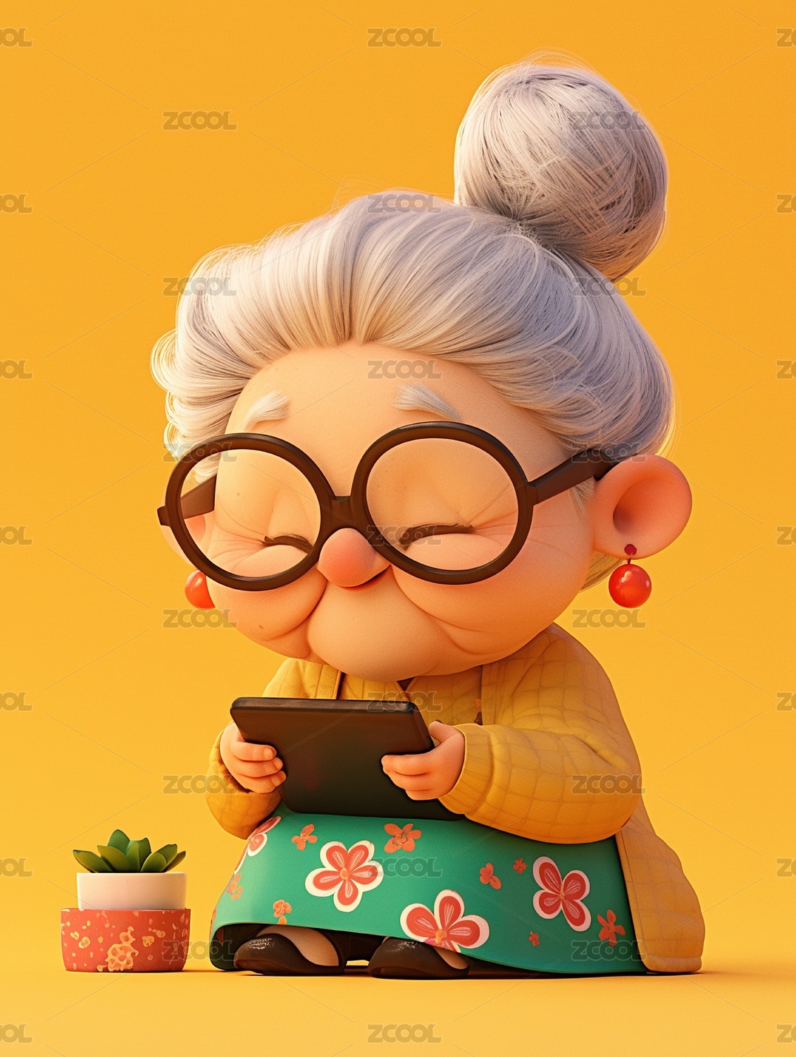 一个3D渲染的可爱卡通老奶奶