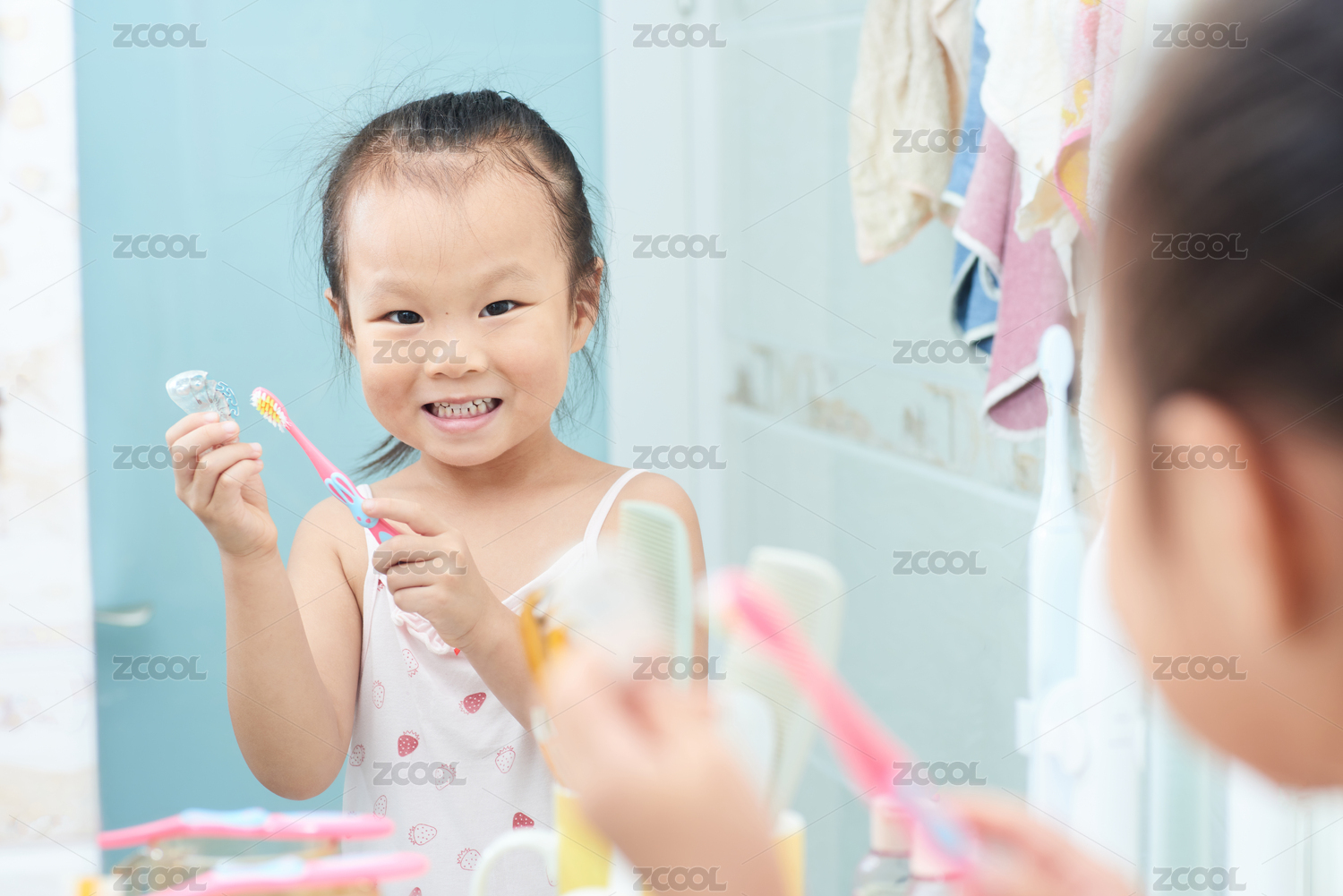 甜美可爱的小女孩的孩子在浴室使用的学习牙刷清洁牙齿由她自己在家里镜子反射的图像背景。