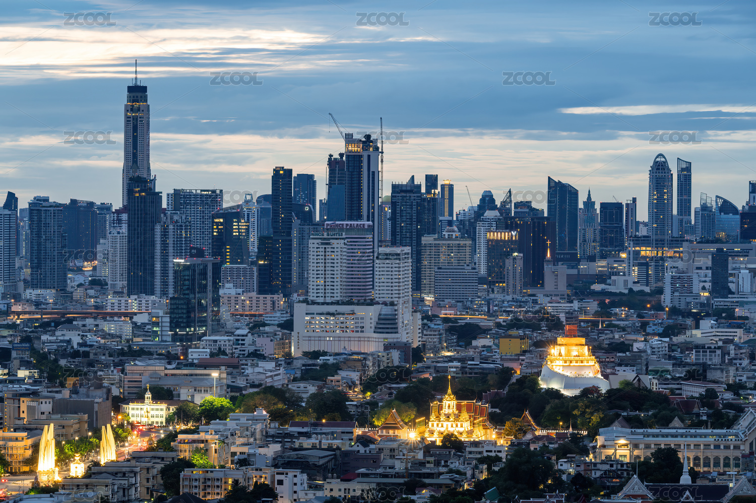 泰国曼谷暮色下的湄南河畔建筑群和寺庙