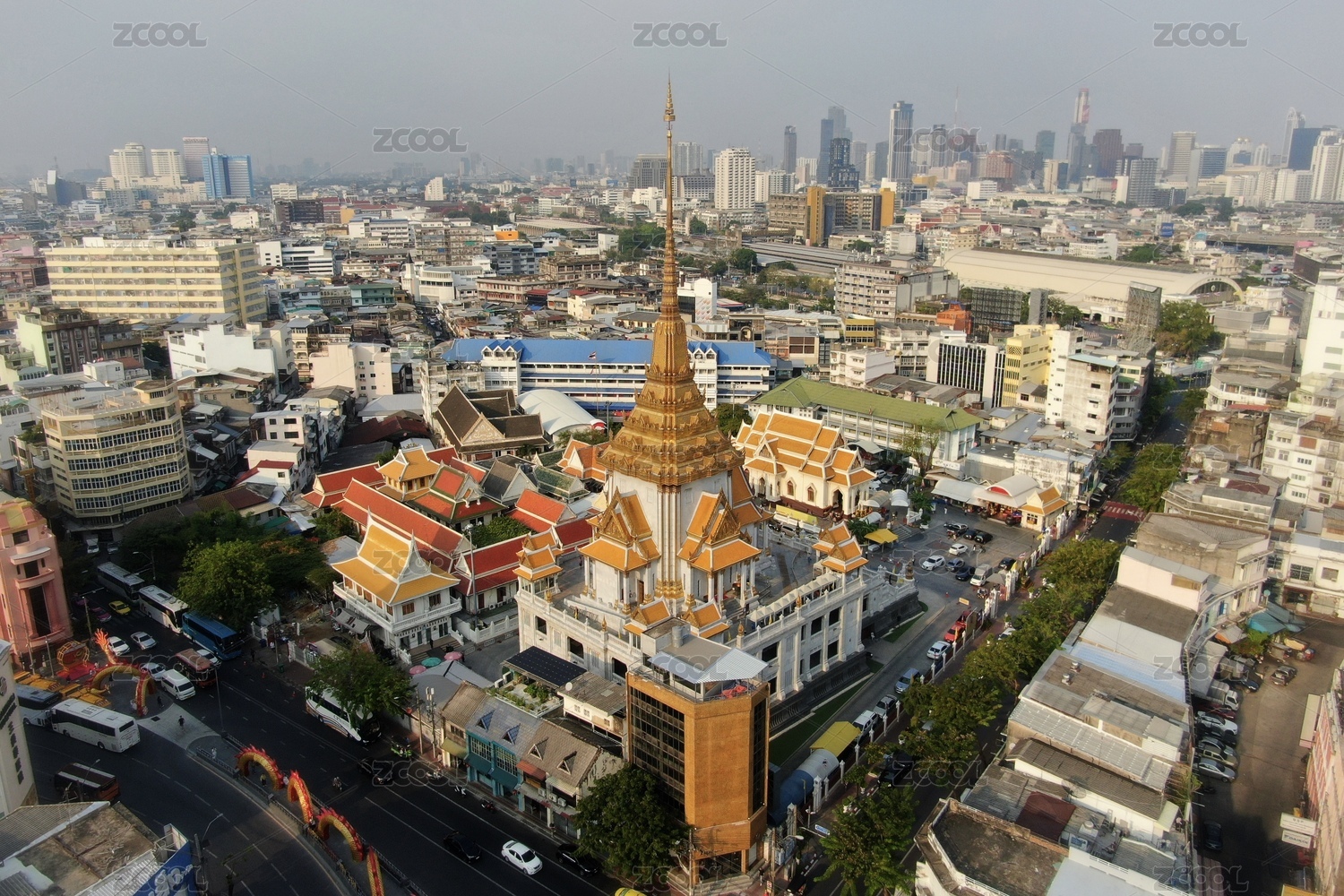 泰国曼谷郑王庙湄南河航拍城市天际线风光