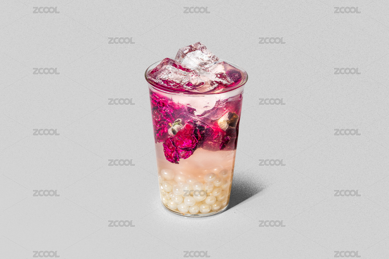 白色桌面上有一杯玫瑰花珍珠椰子水