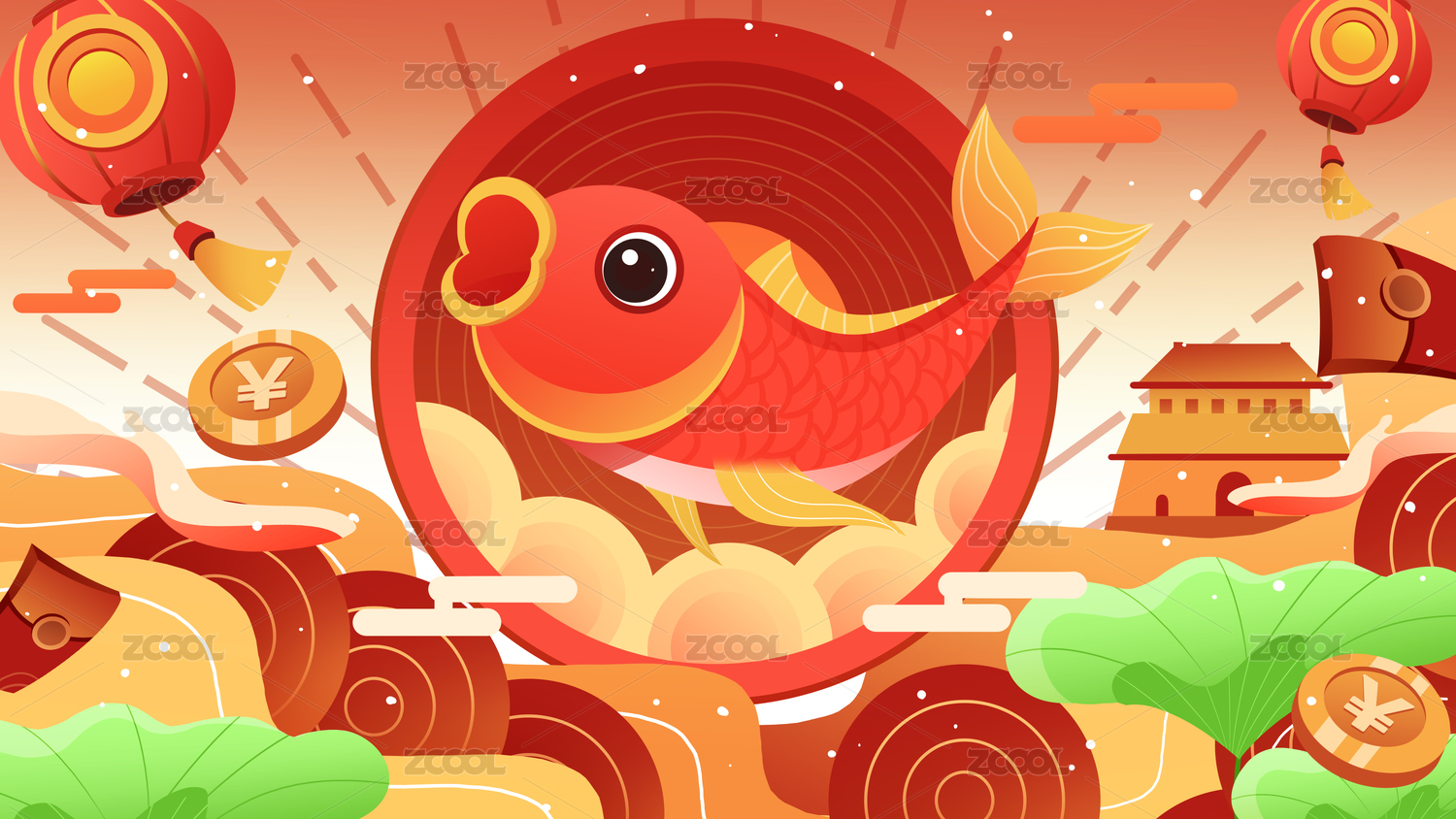 两条锦鲤咬住一块钱币国潮年年有余插画