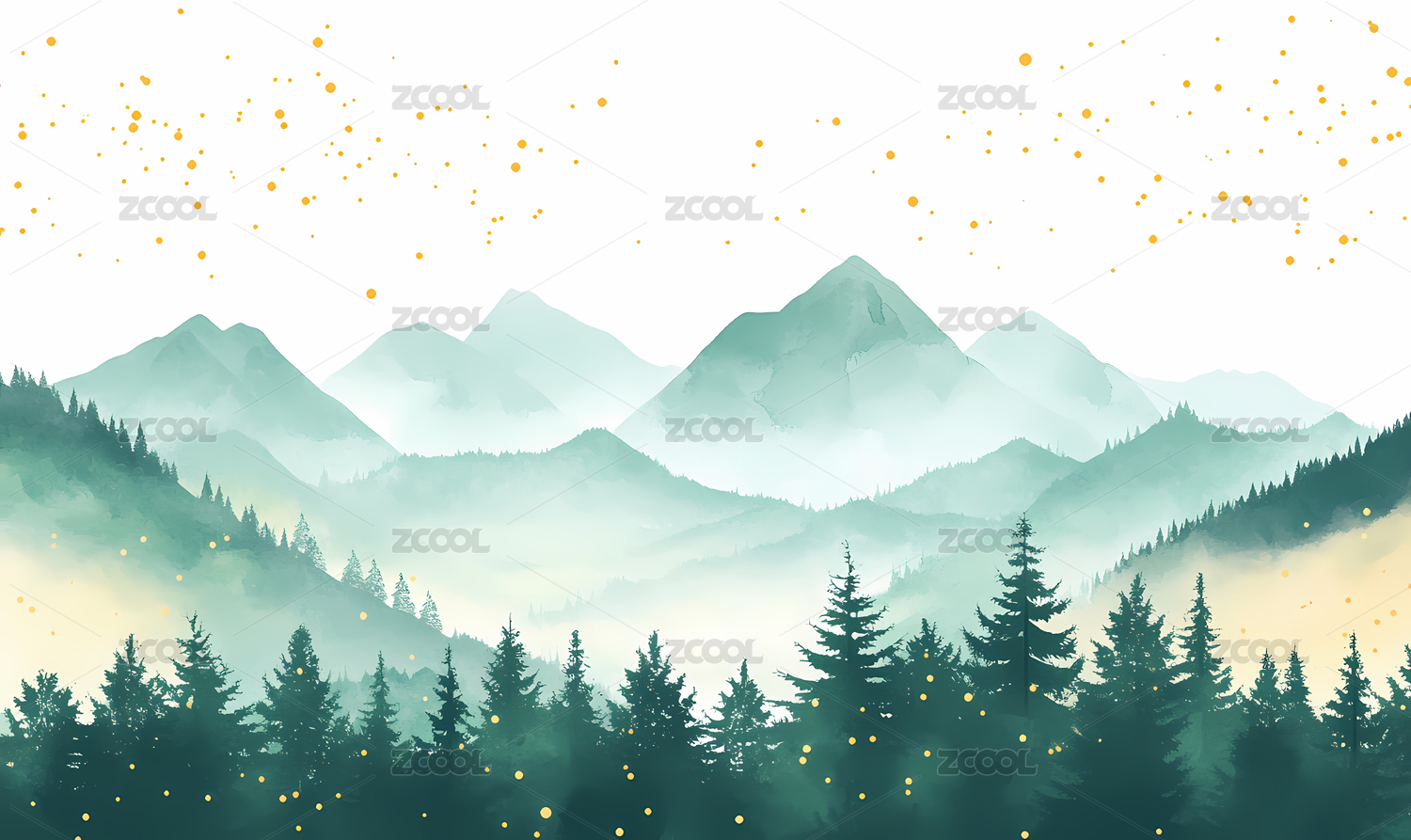 绿色系山间的松树林插画 森林中层叠的云雾插画