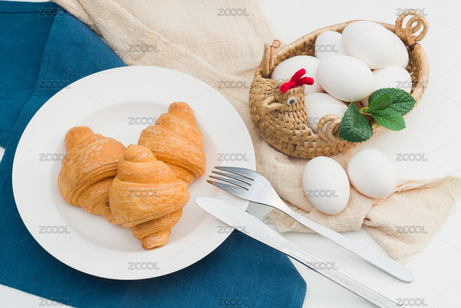 鸡蛋,面包,早餐,牛角面包,可颂,营养,健康,水果,柠檬,盘子