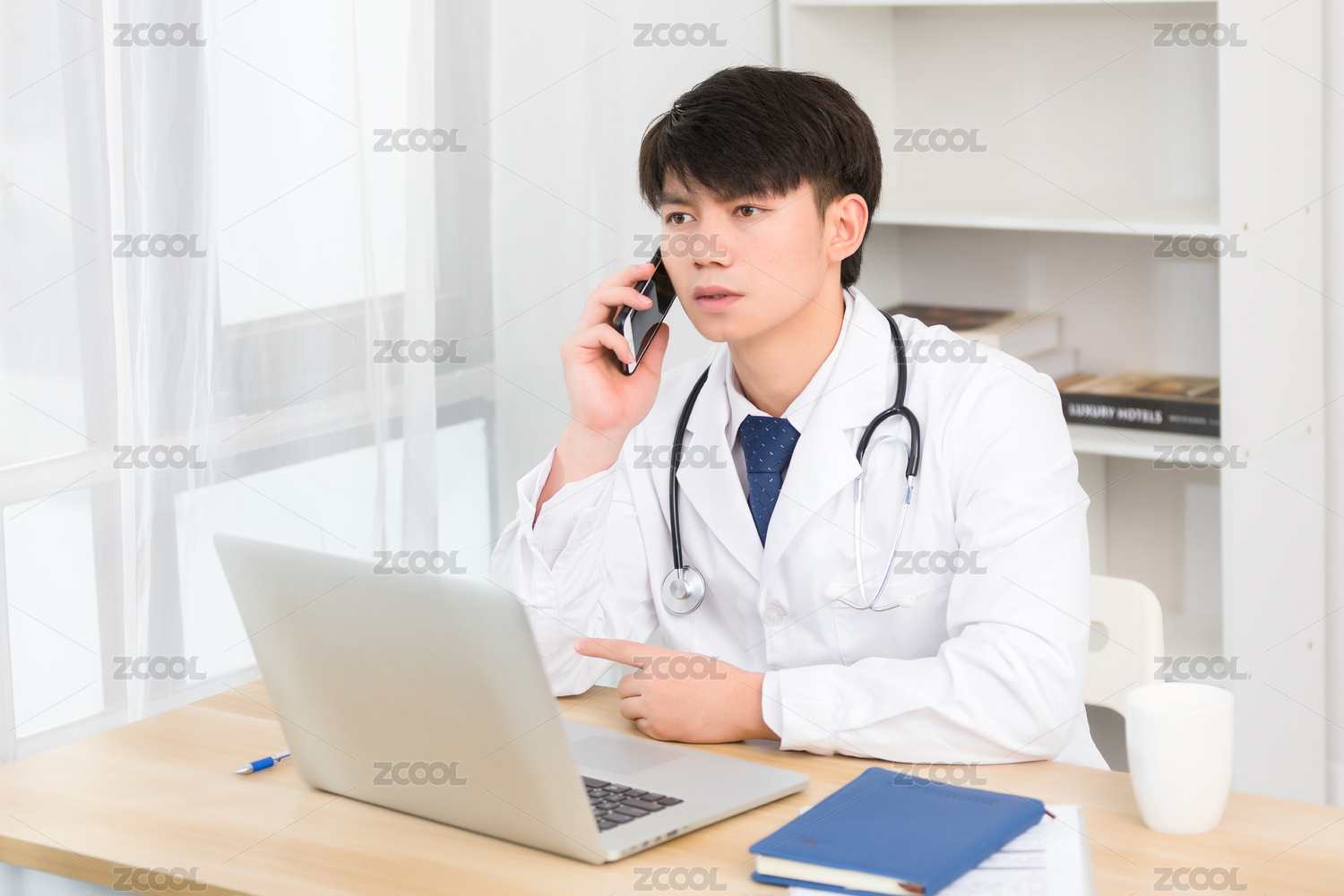 坐在办公室里正在进行电话问诊的亚洲男医生