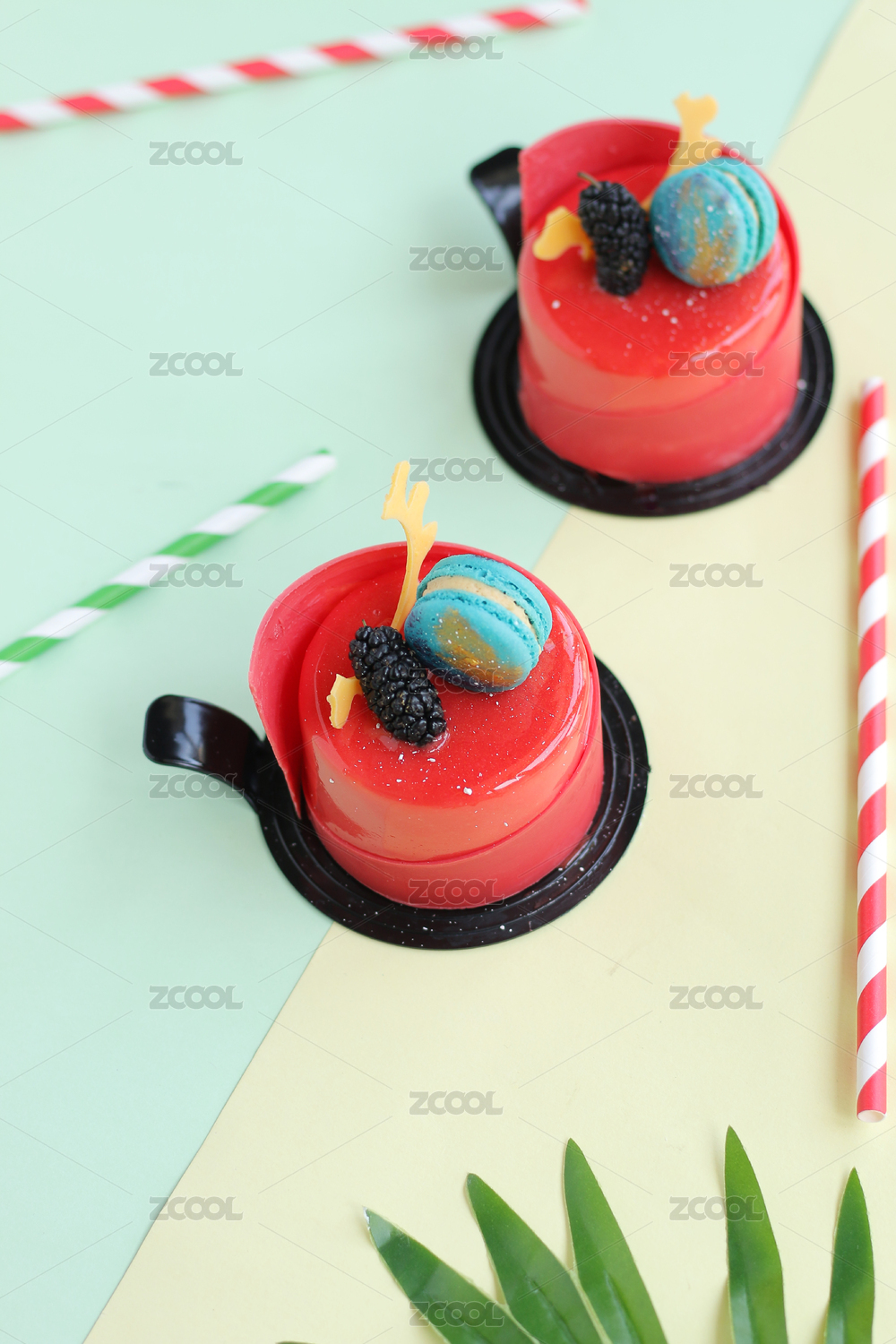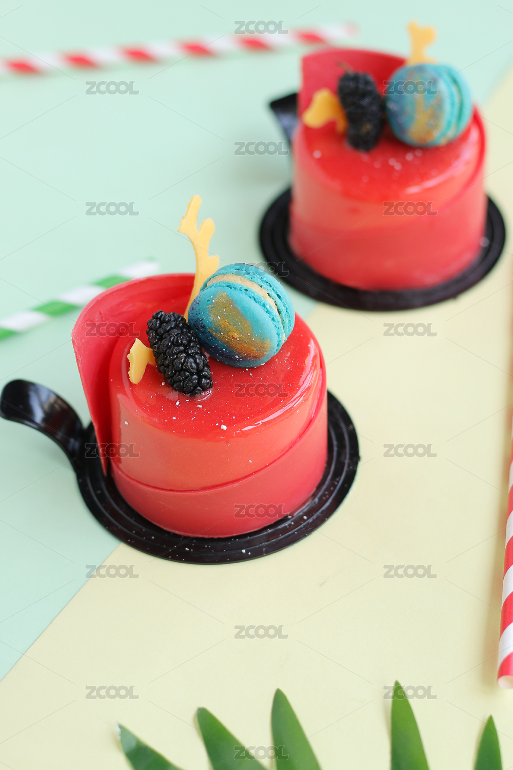 放在彩色卡纸上的红绿双色淋面慕斯蛋糕