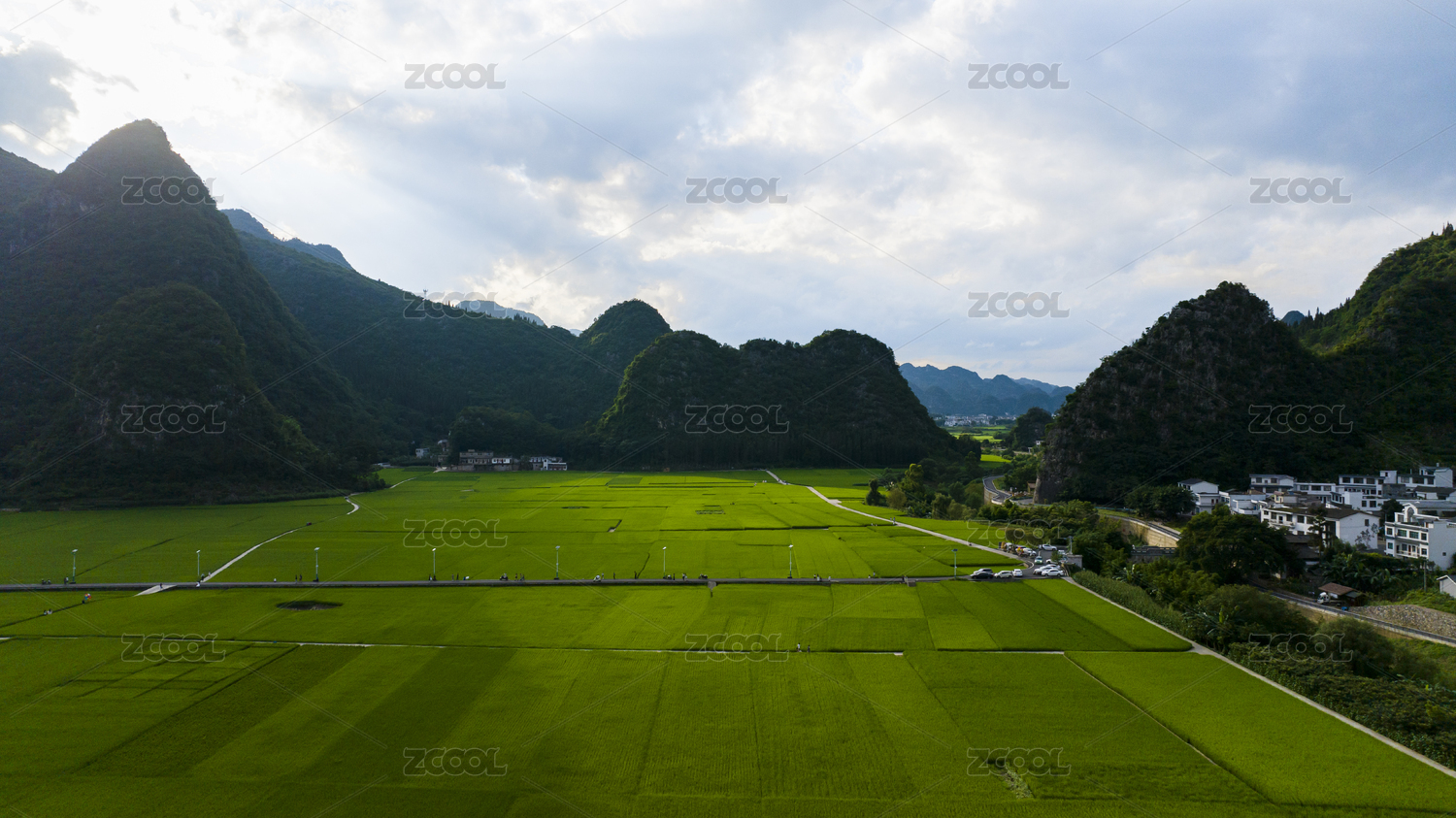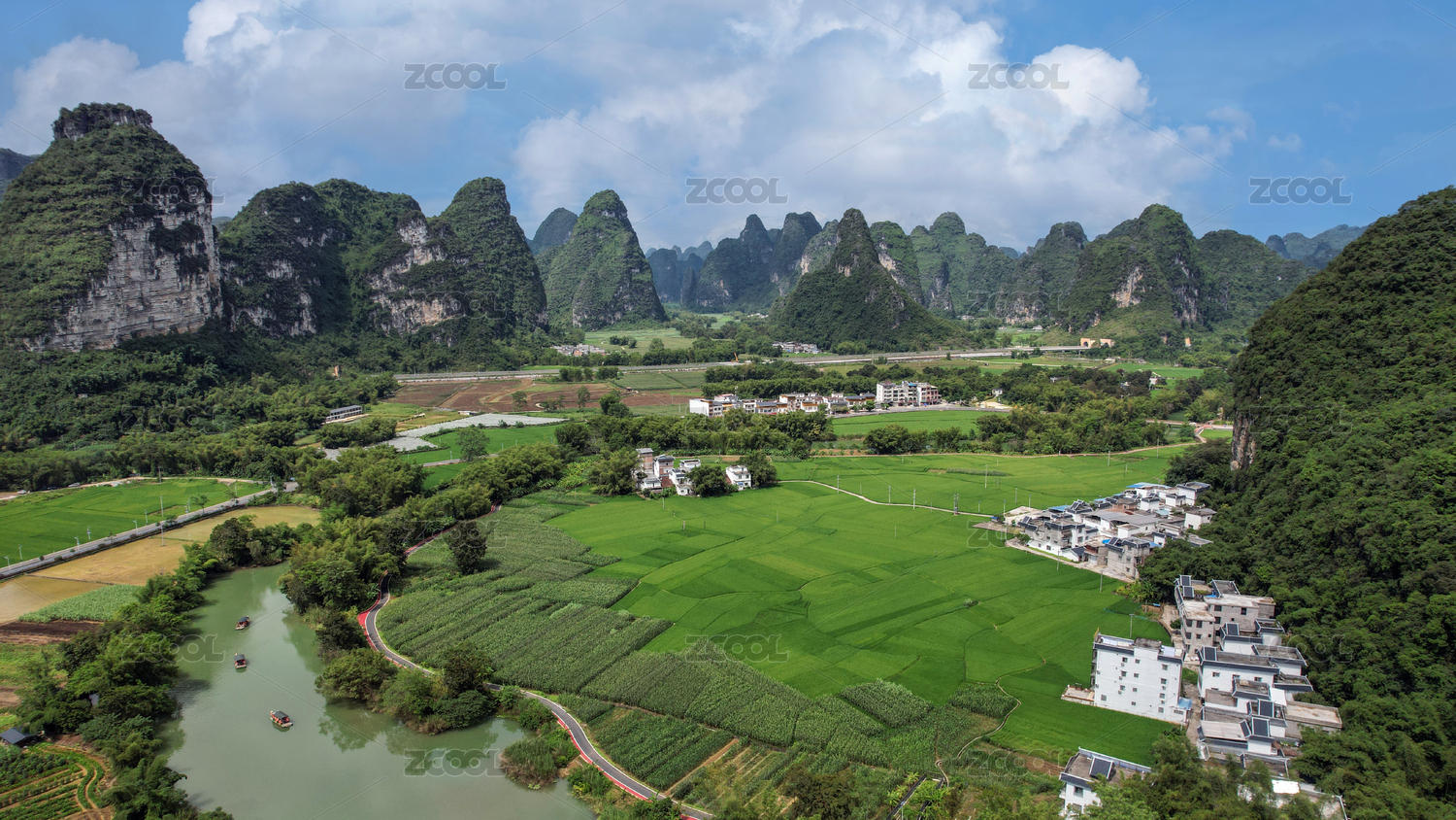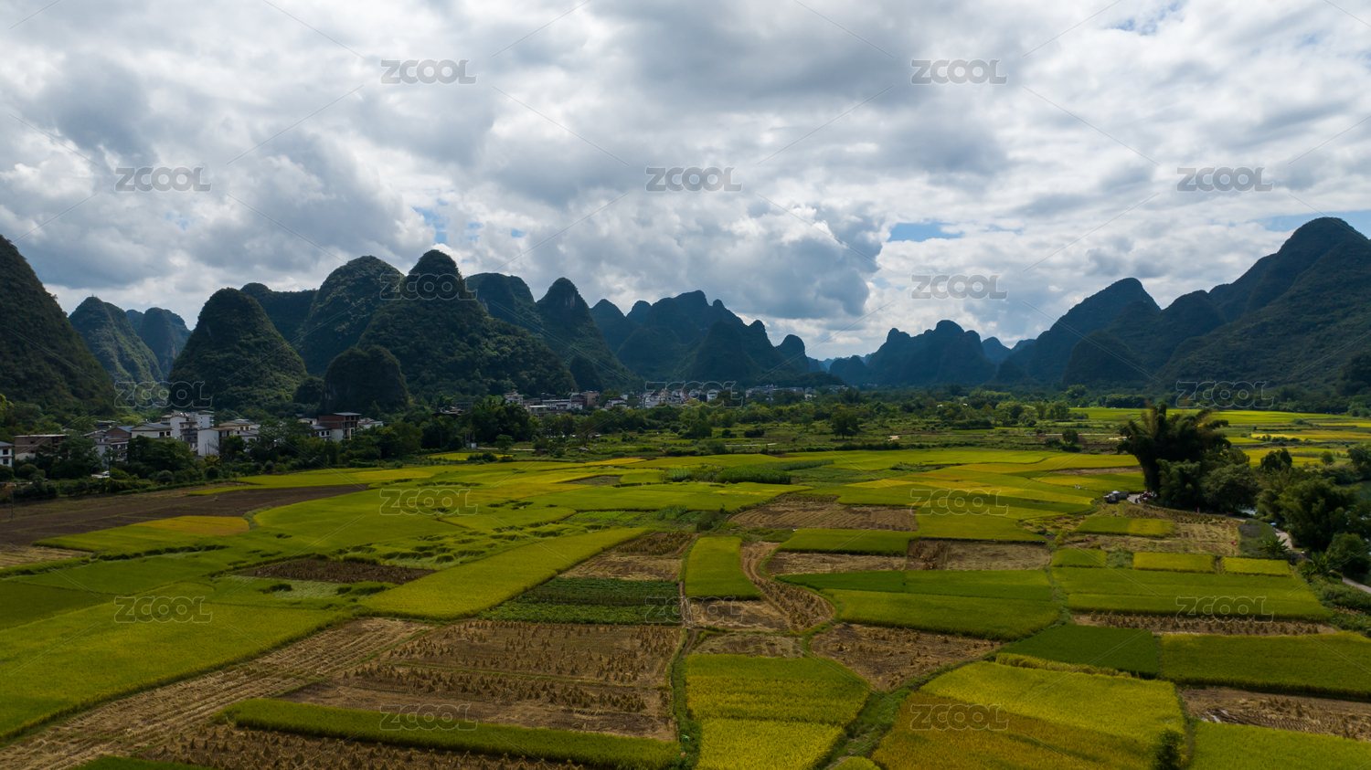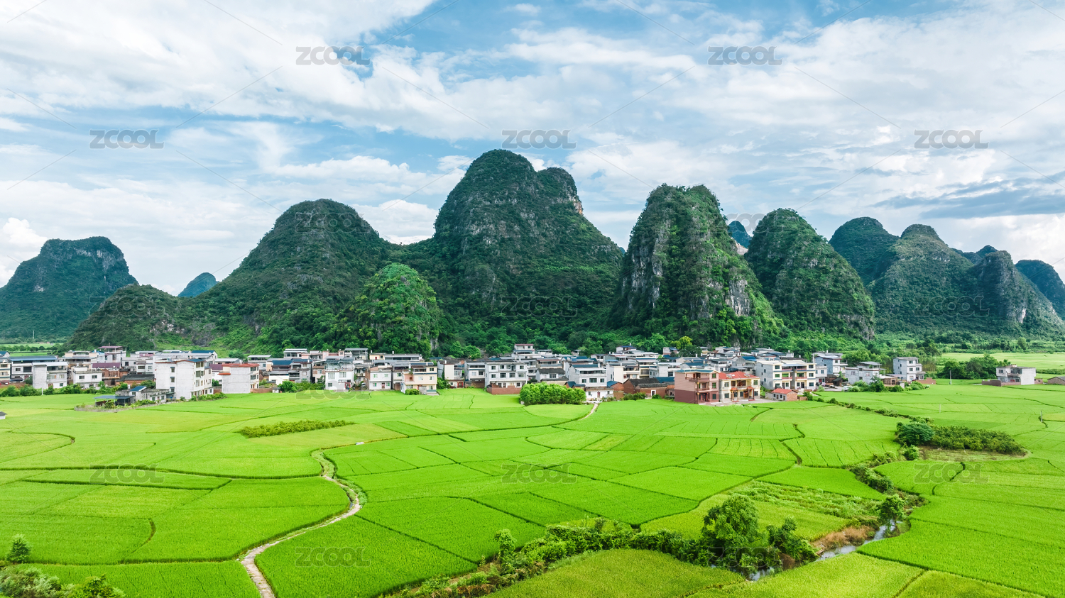 蓝天白云阳光下桂林山间的村庄和绿色稻田