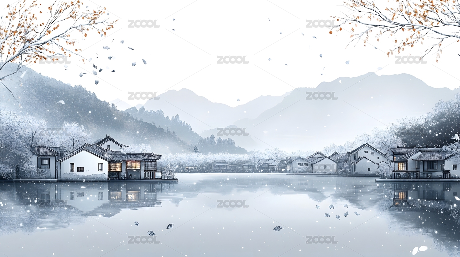 雪景,冬天,山水,中国风,水墨,下雪,雪山,湖面,中式建筑,传统