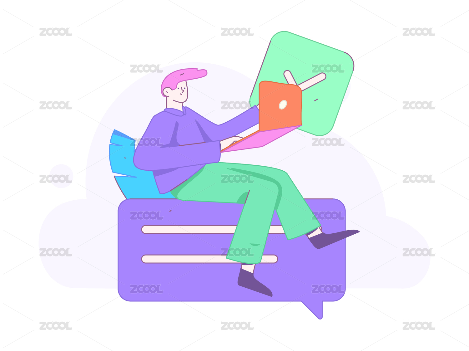 一个男子坐在沙发上居家办公桌子书本矢量插画