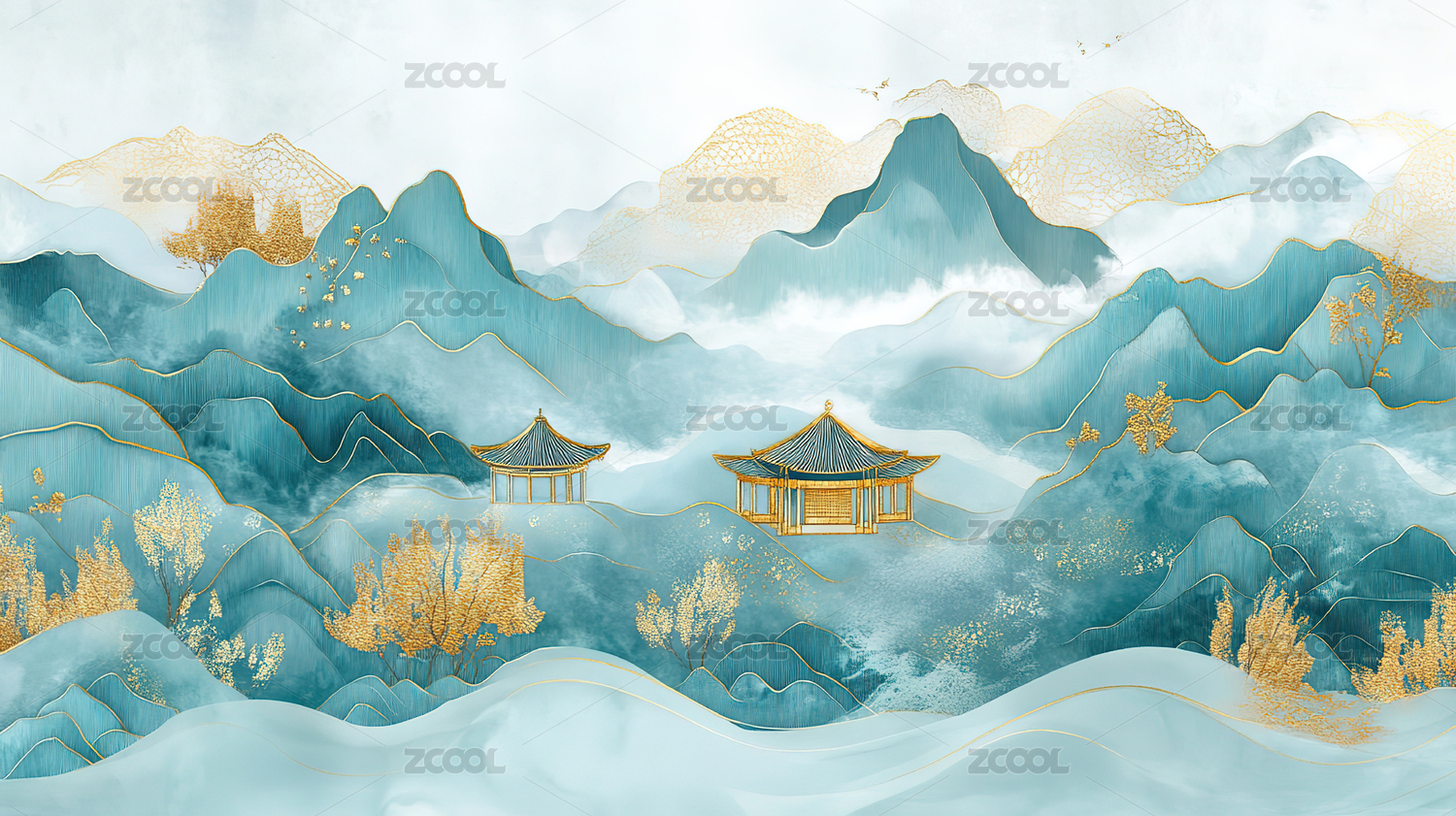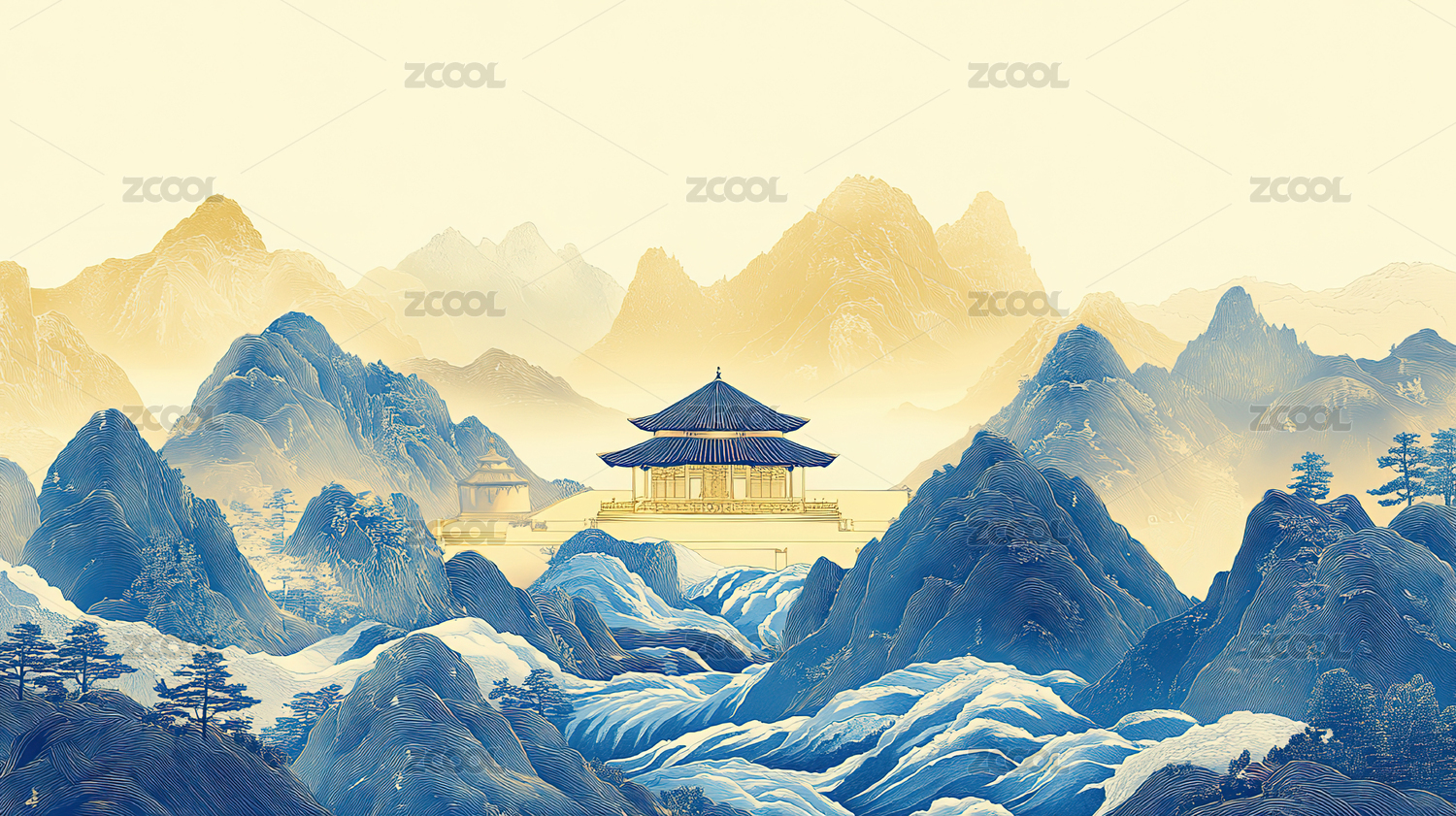 金色山峦青翠亭台水墨画