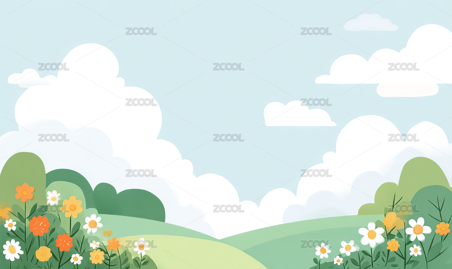 蓝天鲜花白云户外草地扁平插画