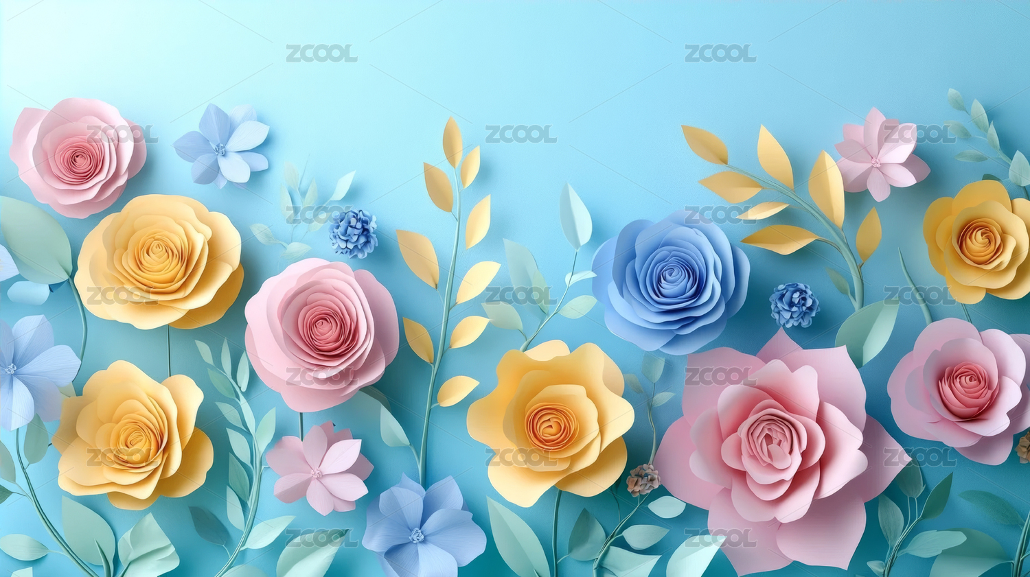 蓝色背景下的花朵花卉装饰3D剪纸风格