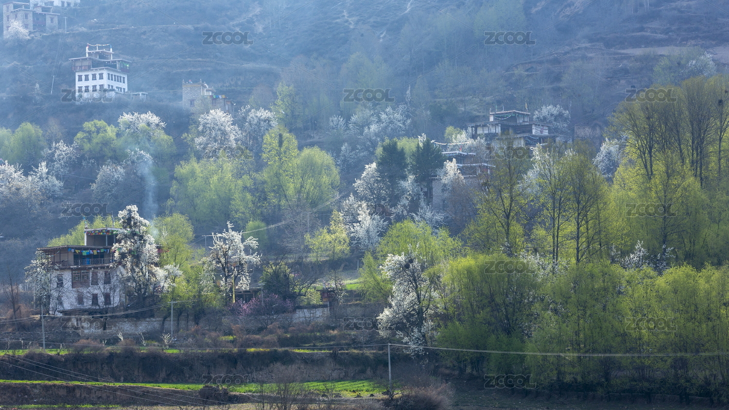 素材,背景,建筑,藏寨,地形,高山沟壑,光影,树,春天,中国