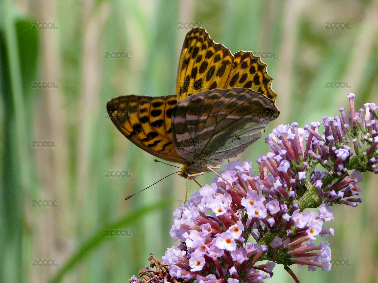 一只吸食花蜜的绿豹蛱蝶