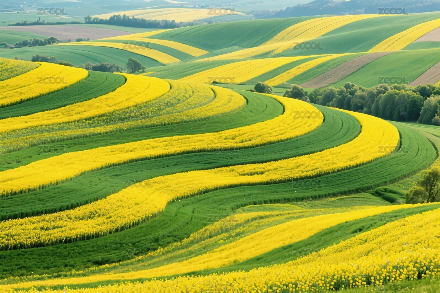 郁郁葱葱绿色田野和连绵起伏彩色波浪