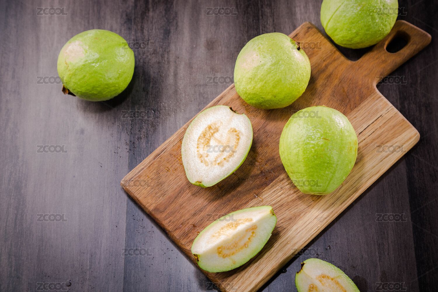 棕色木纹桌上放着一些芭乐水果