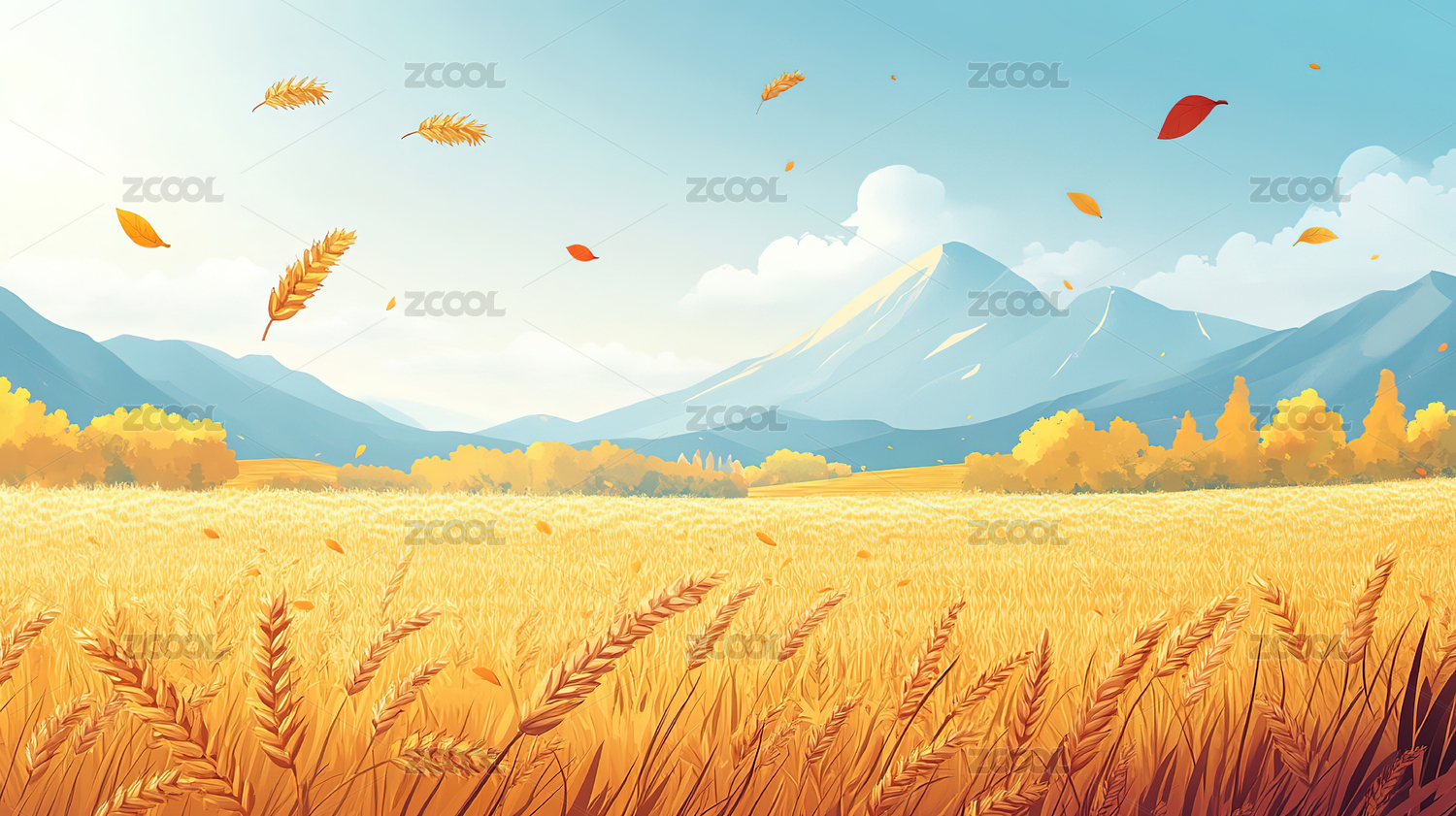 夏天晴朗天空下成熟的金黄色麦田插画绘画