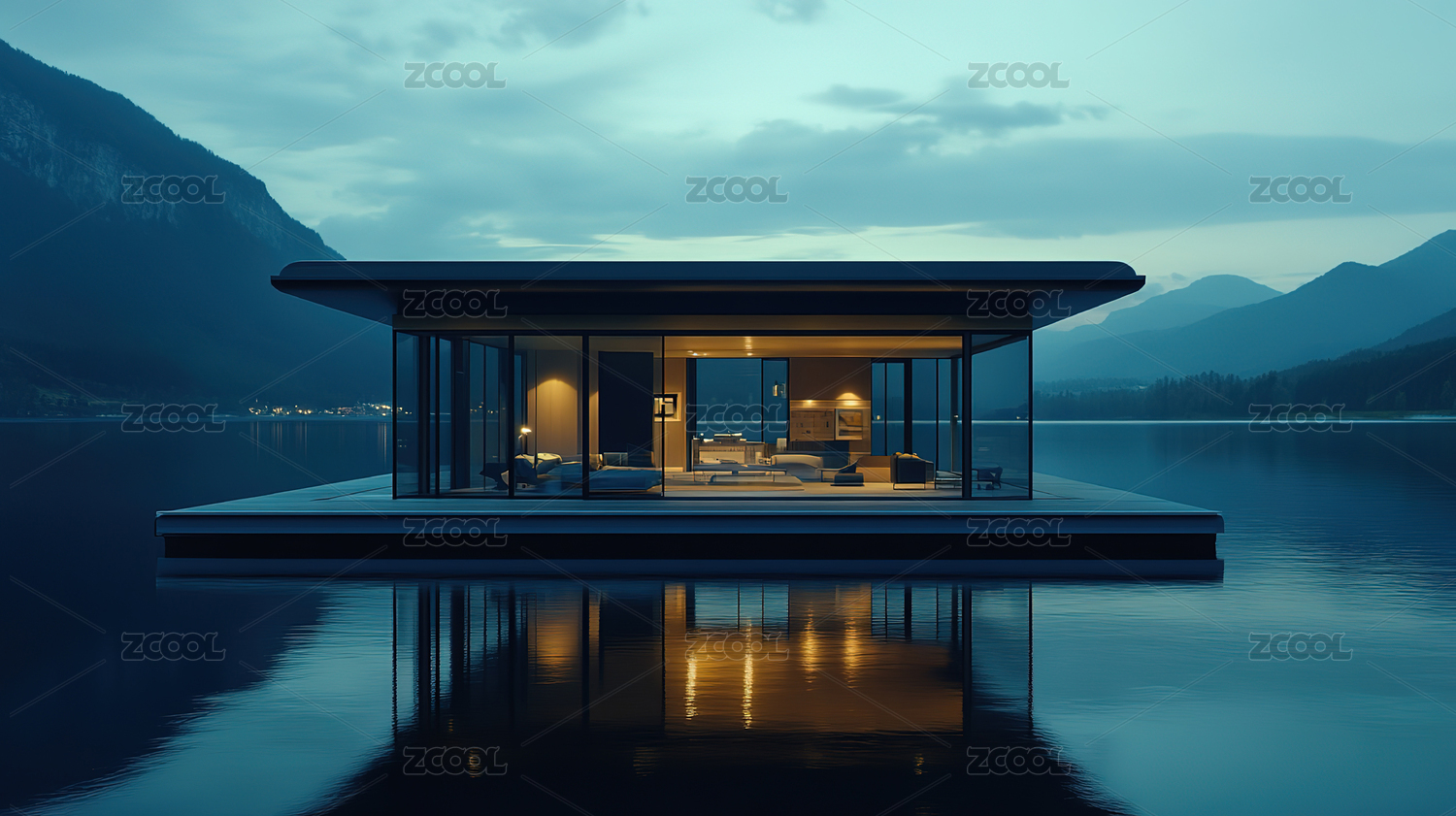 现代湖畔别墅夜景
