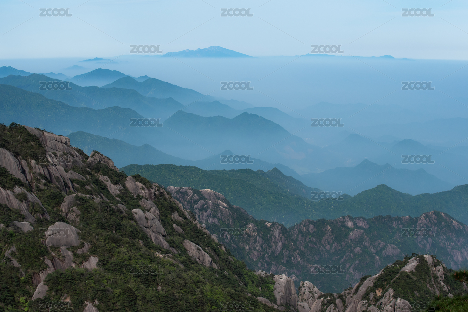 远望安徽黄山山峰与远处的云海
