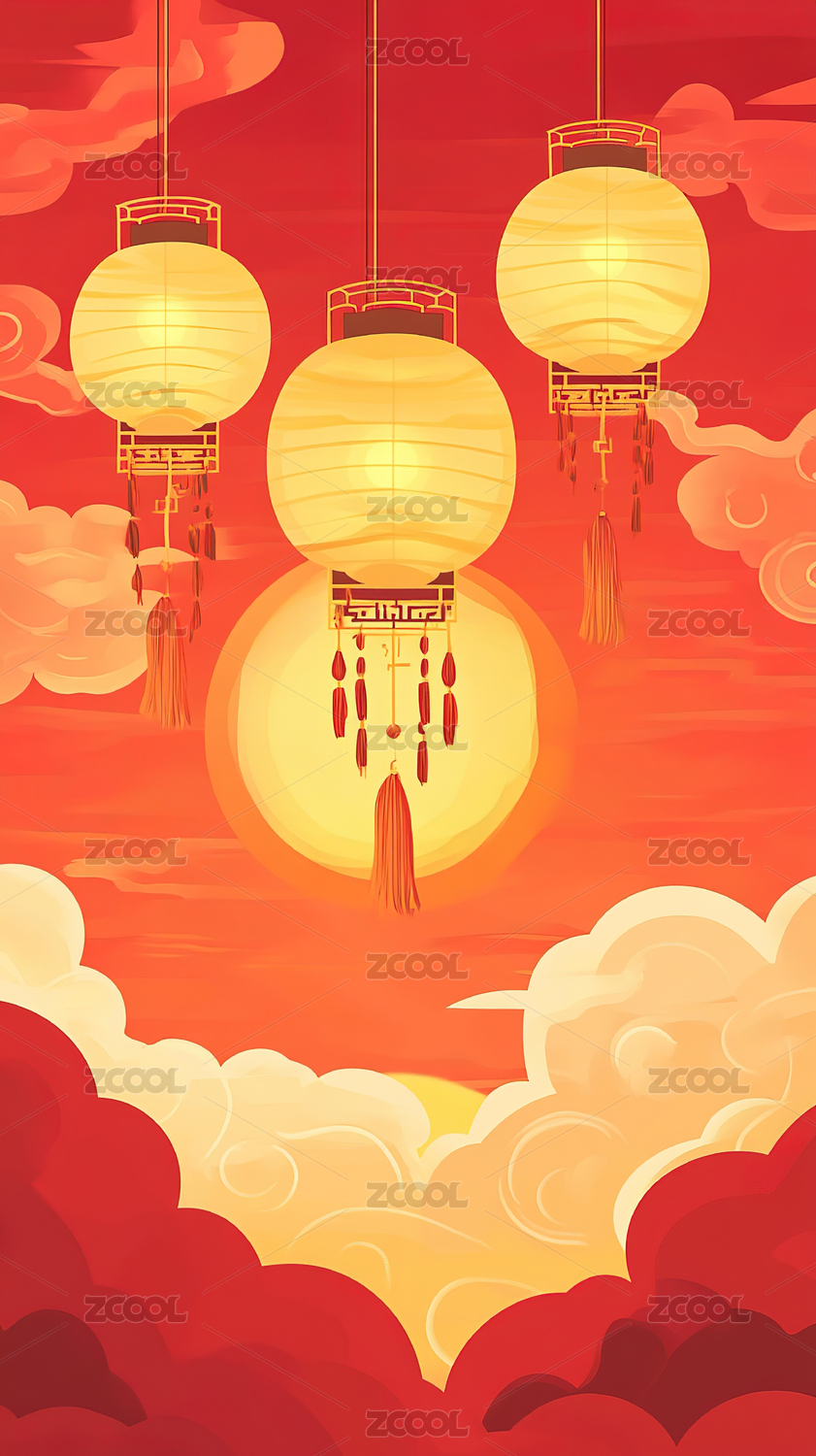 红灯笼和折扇立体剪纸风格节日喜庆背景