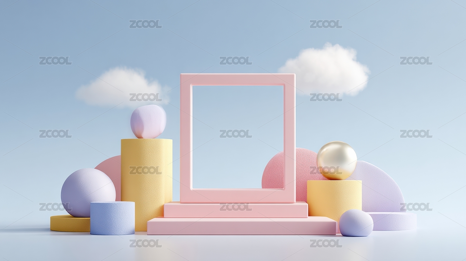 梦幻云朵背景下的几何形状展示