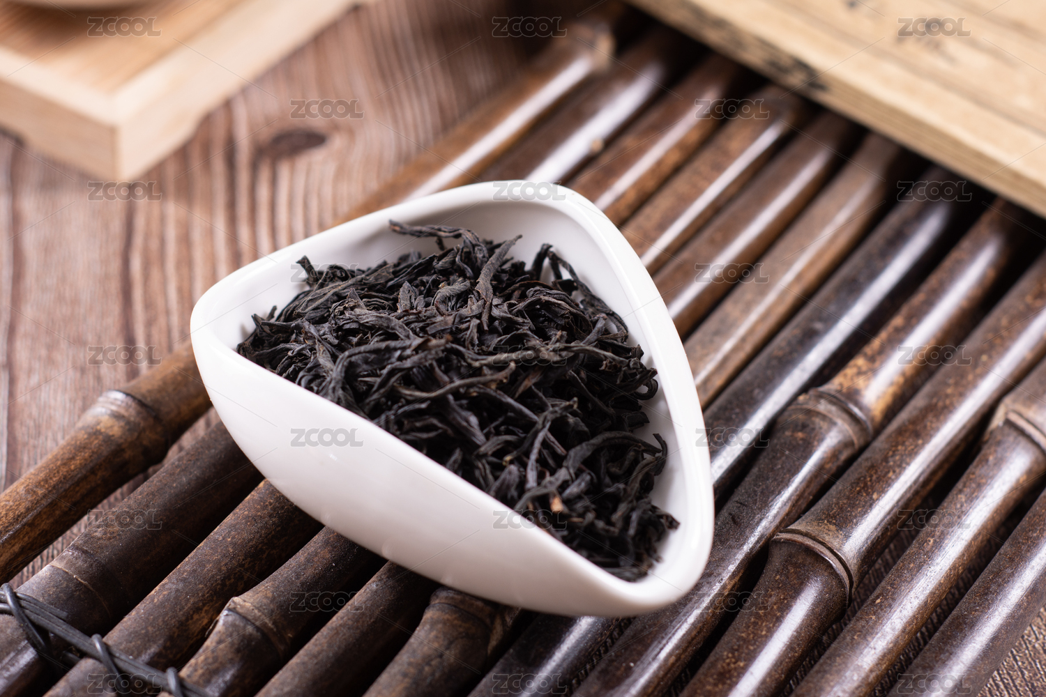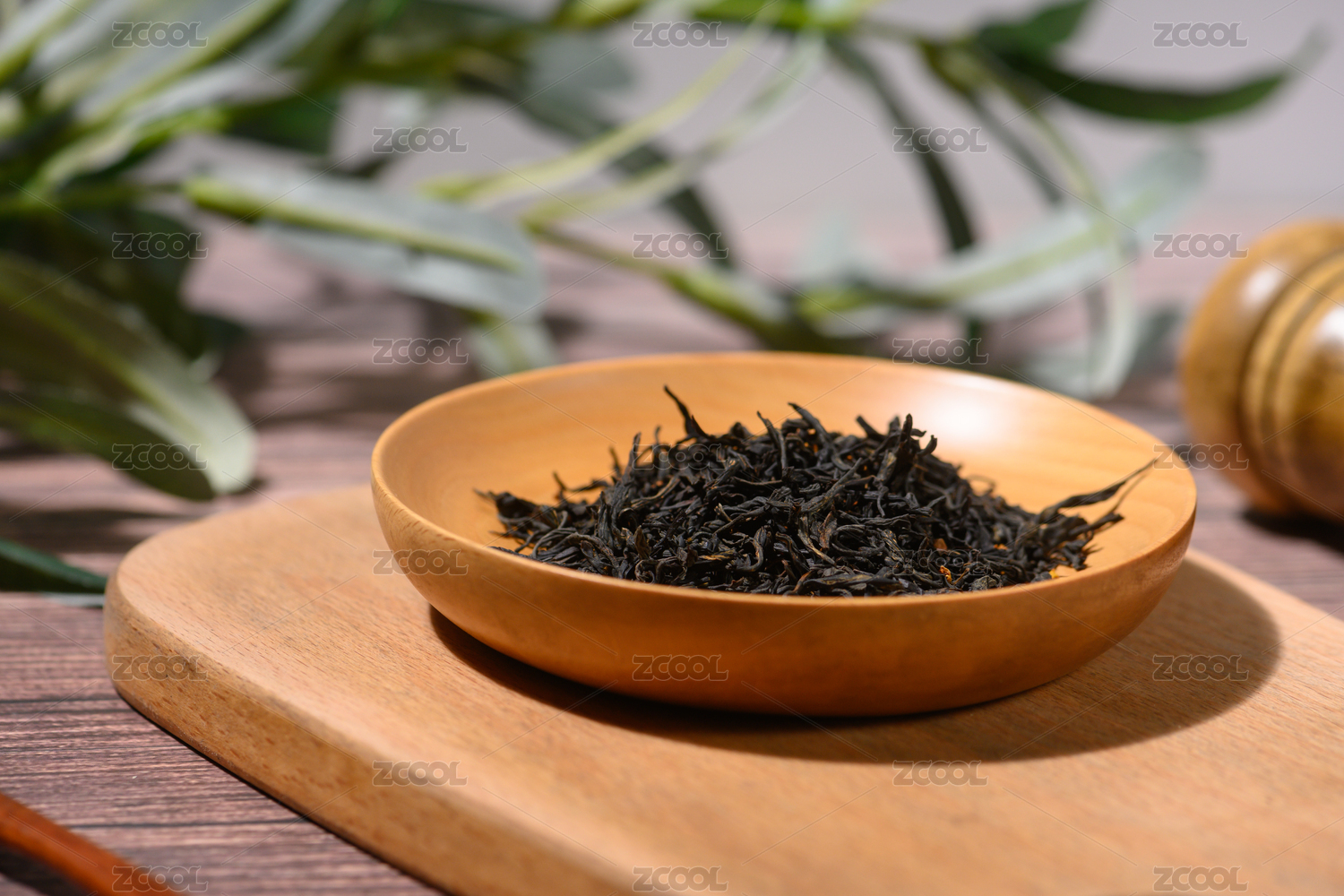 桌面上的竹盘子里的金骏眉红茶茶叶