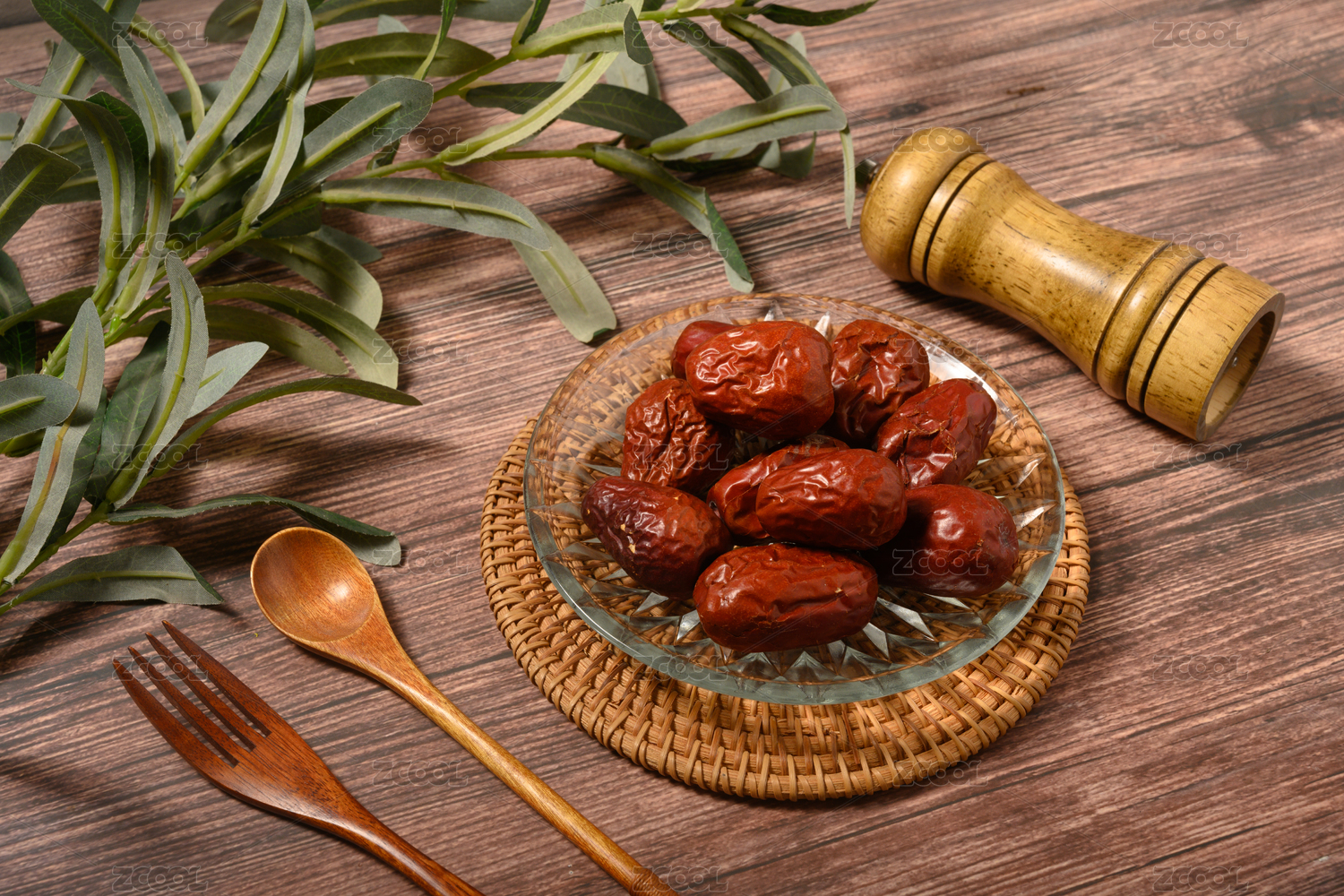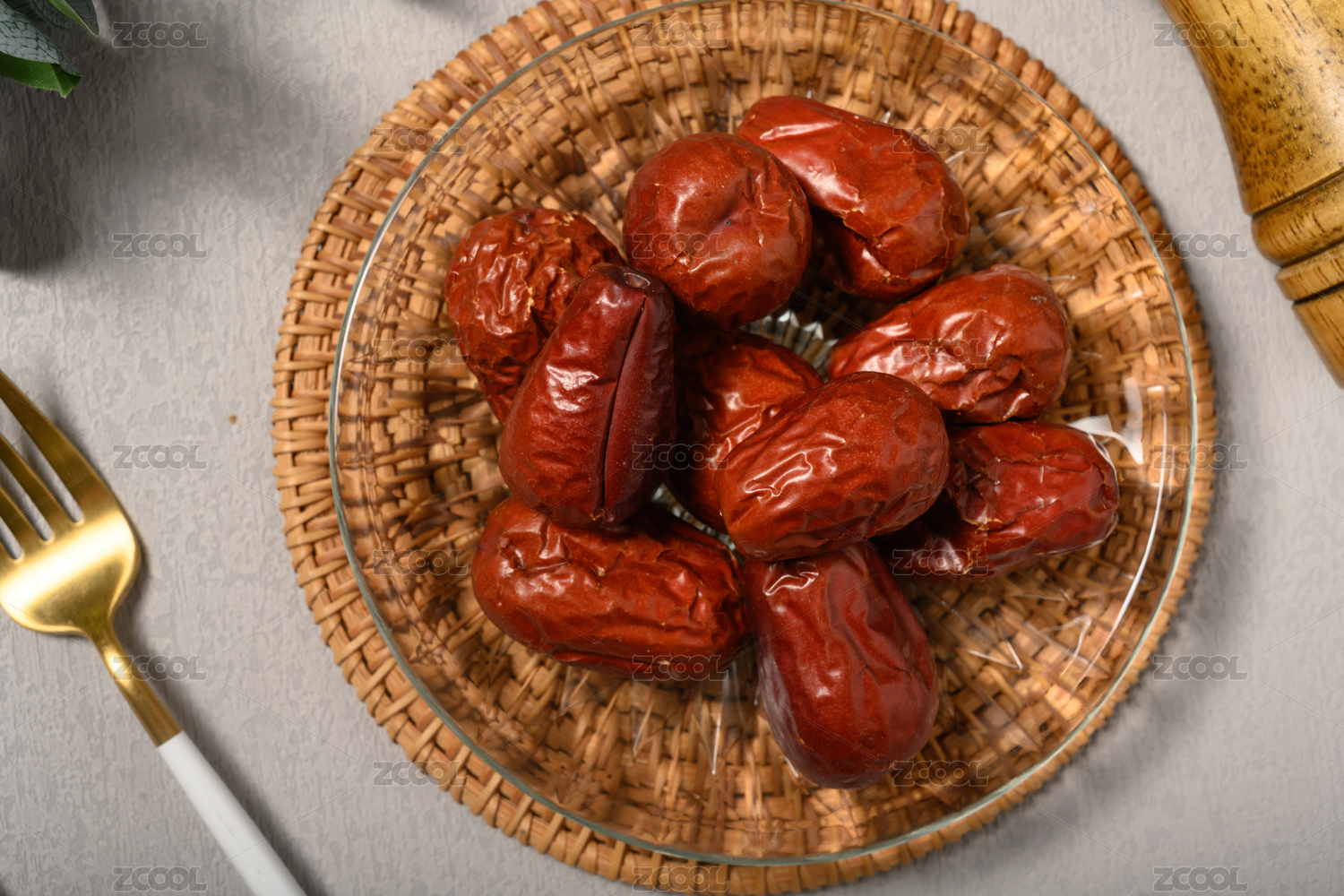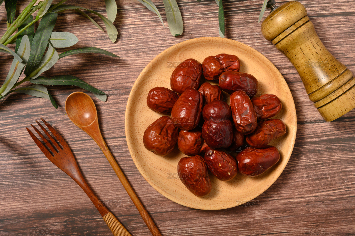 桌面上的木纹盘子里的美味可口的红枣