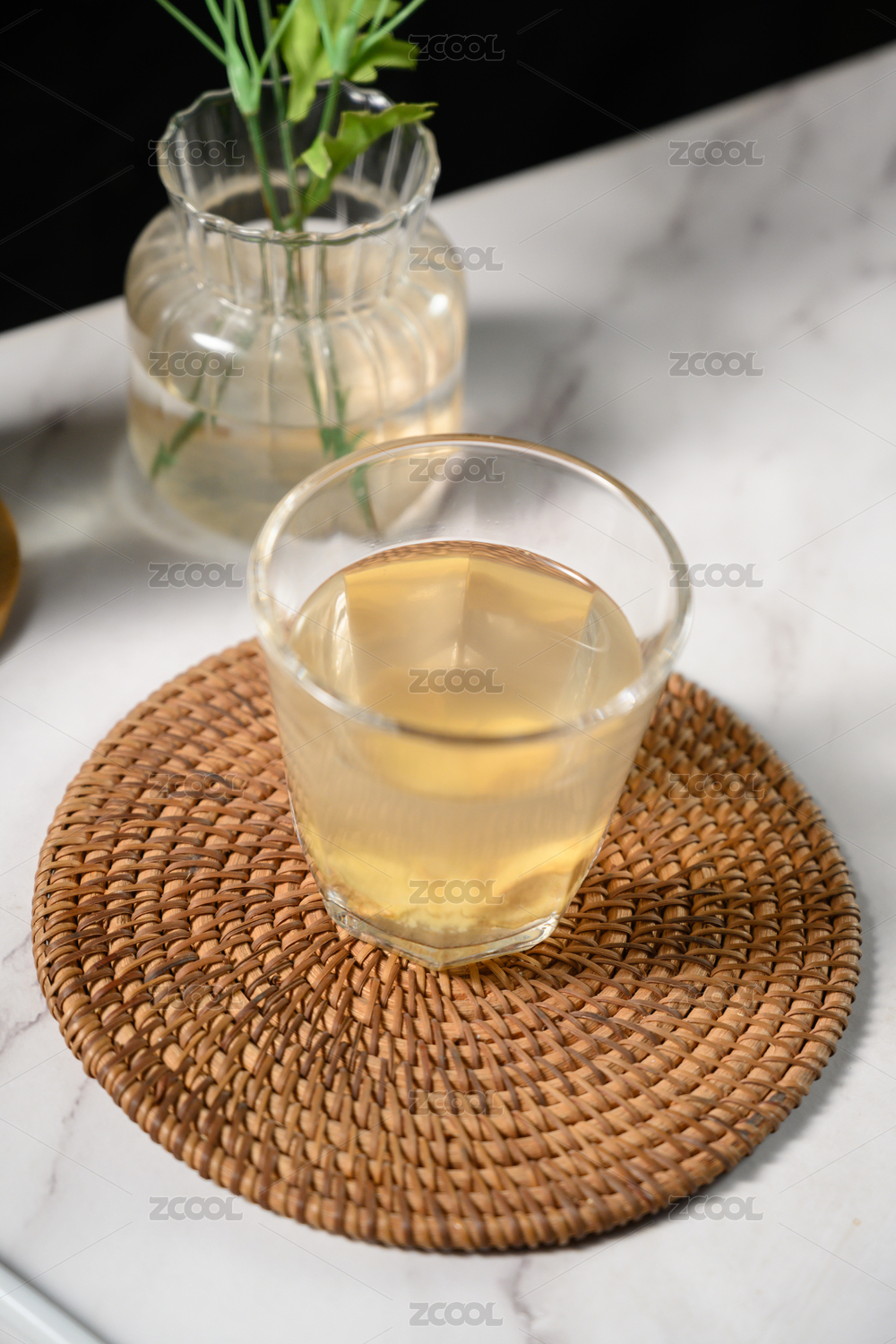 桌面上的杯子里的香甜可口的牡丹花苞茶