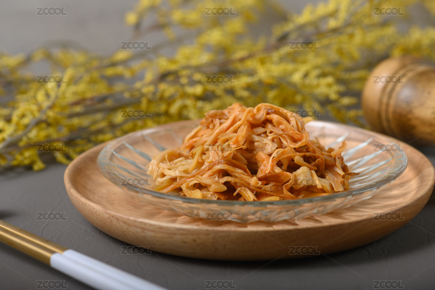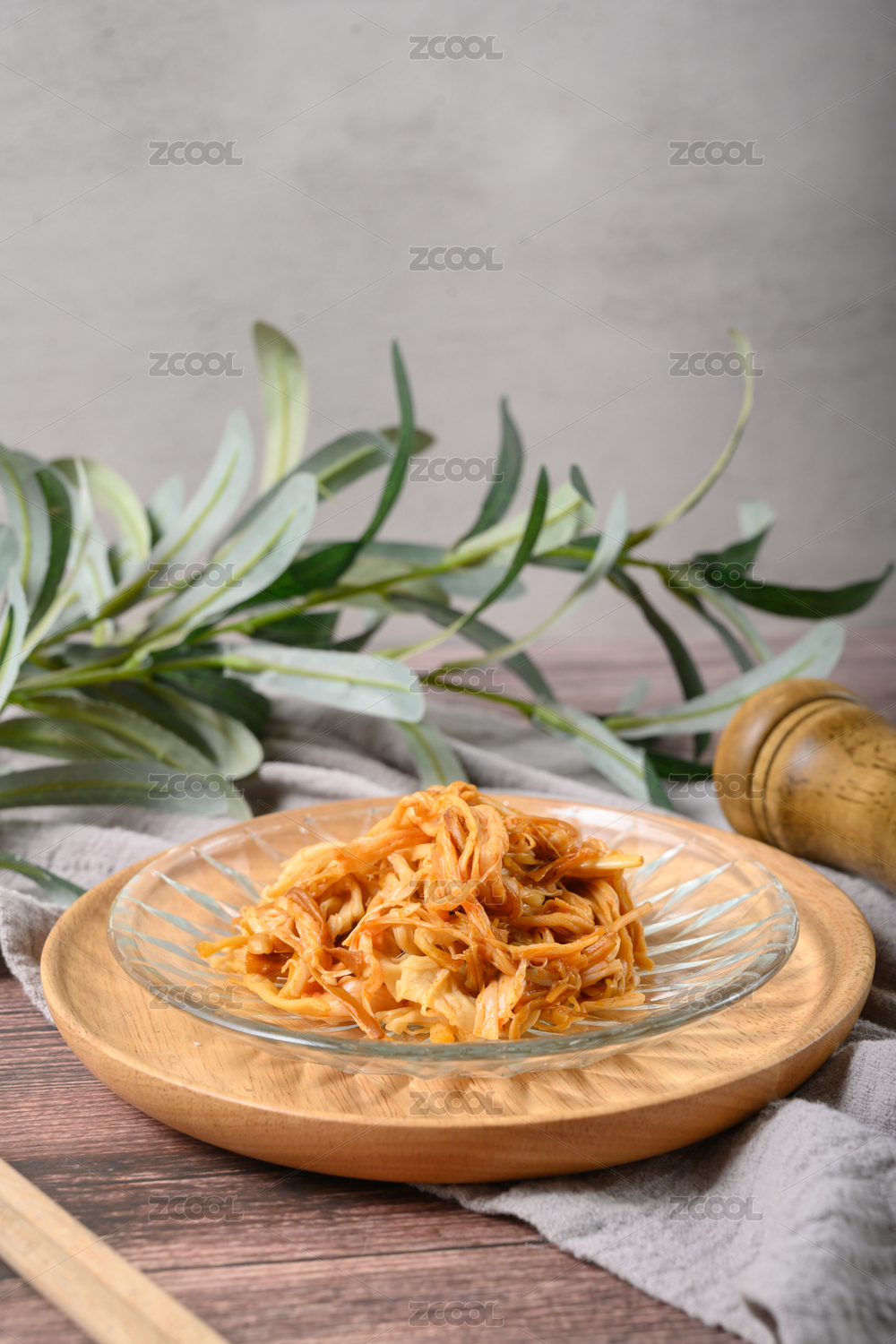 桌面上的盘子里的美味可口的香辣金针菇