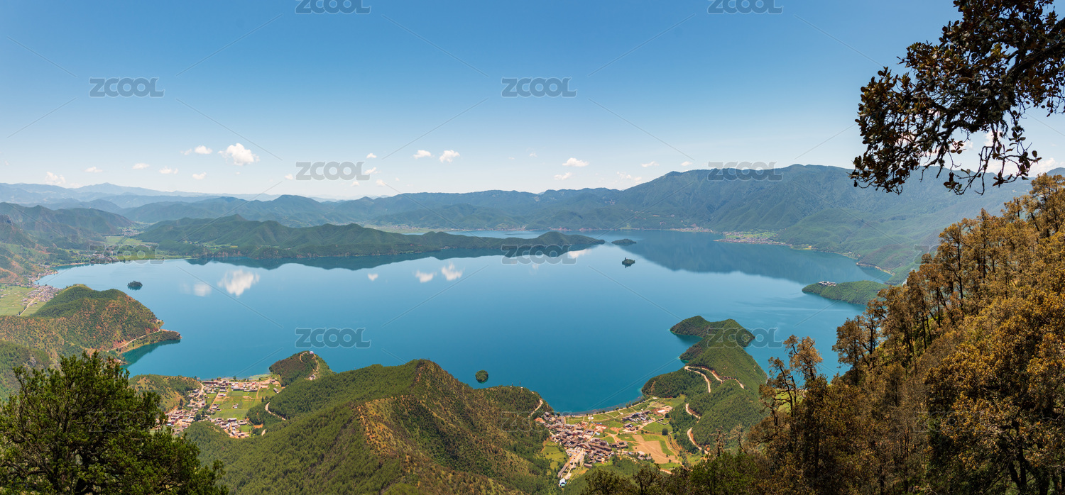 从高处远眺中国云南省丽江市蓝天白云下的泸沽湖