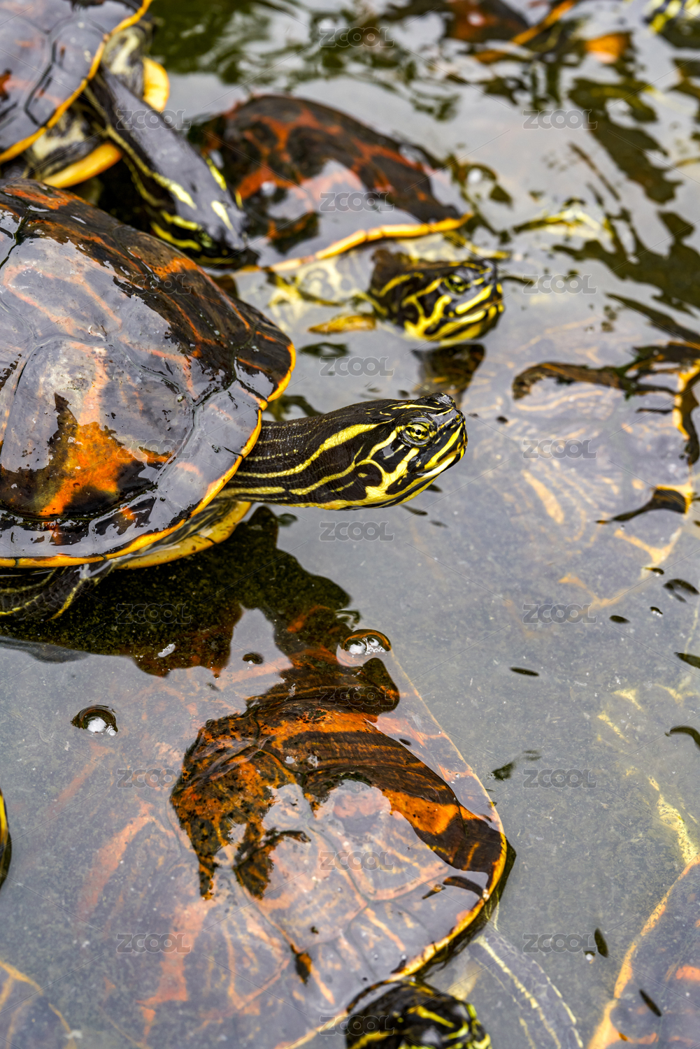 水池里的一群火焰龟特写