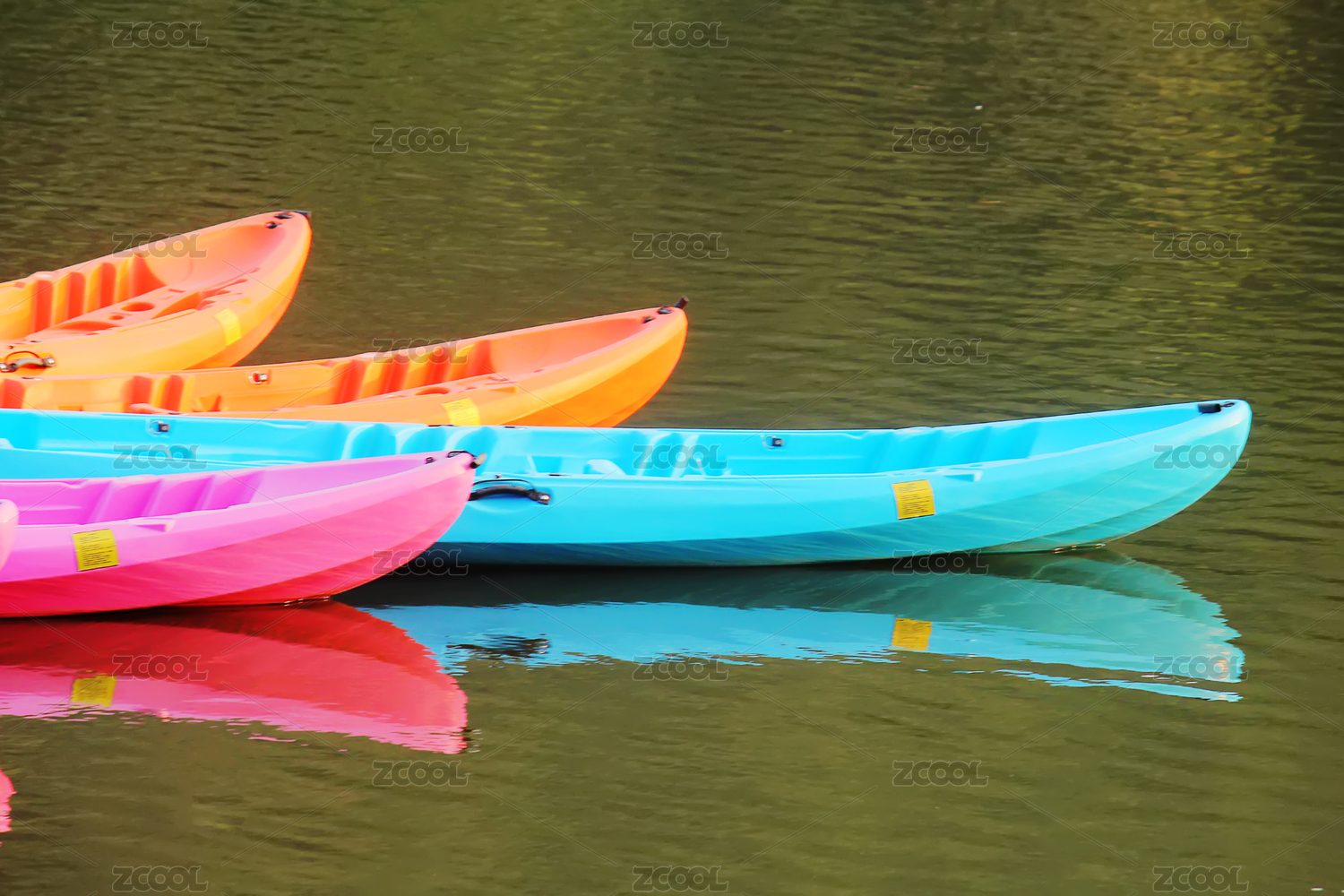 绿色湖面上停靠的彩色皮划艇