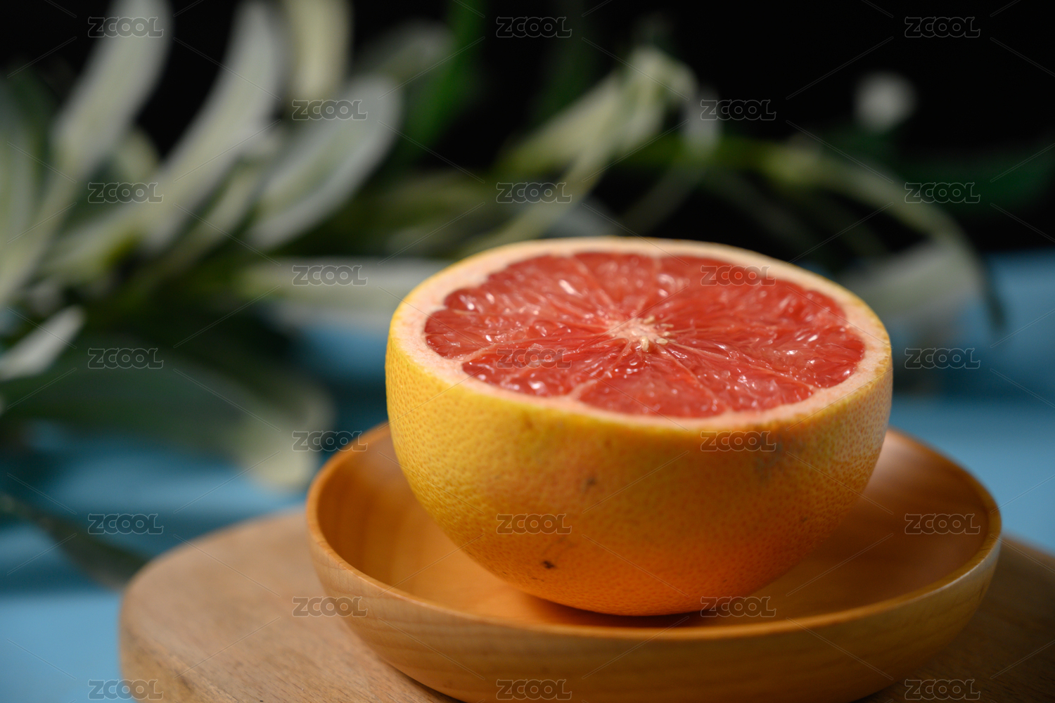 桌面上的盘子里的切开的西柚