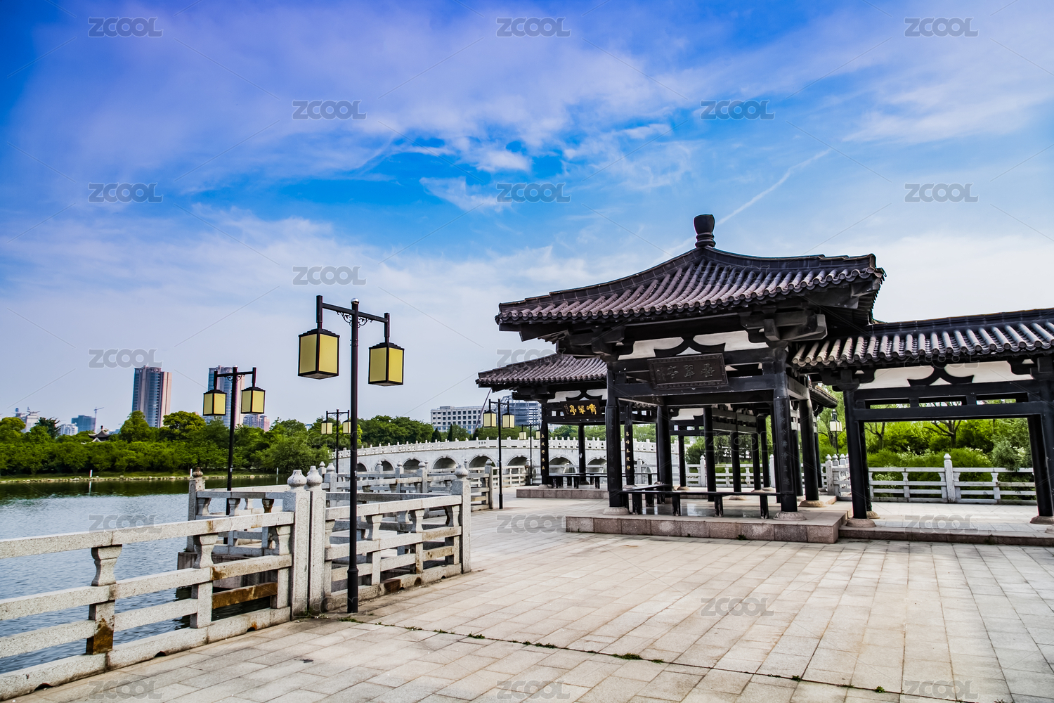 晴天里中国微山湖里的白色石桥和远处的红色古建筑