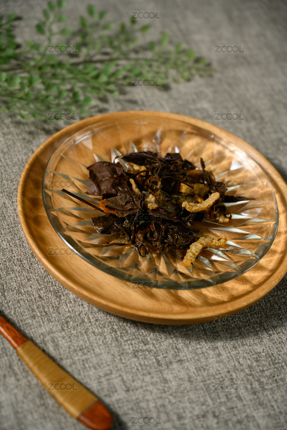 桌面上的盘子里的美味可口的陈皮白茶叶