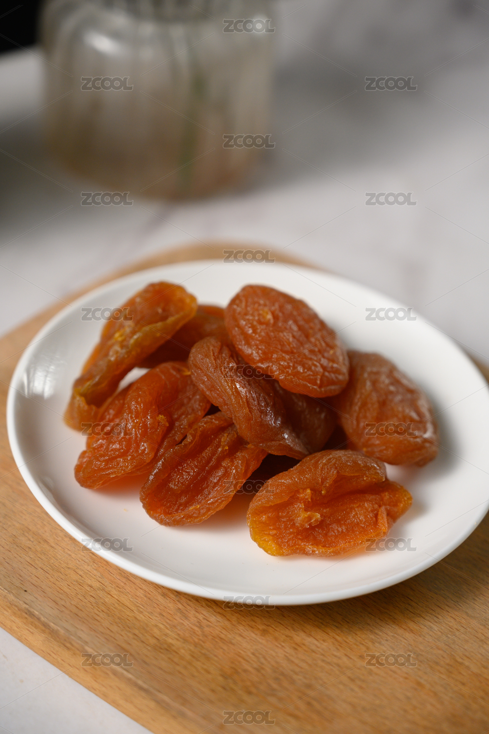 桌面上的盘子里的美味可口的红杏干