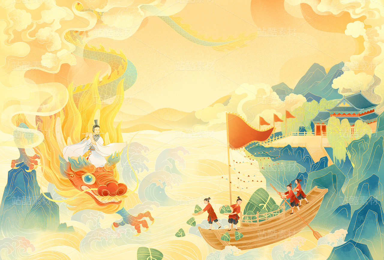 端午节祥云金龙古人粽子船青山宫殿国潮插画