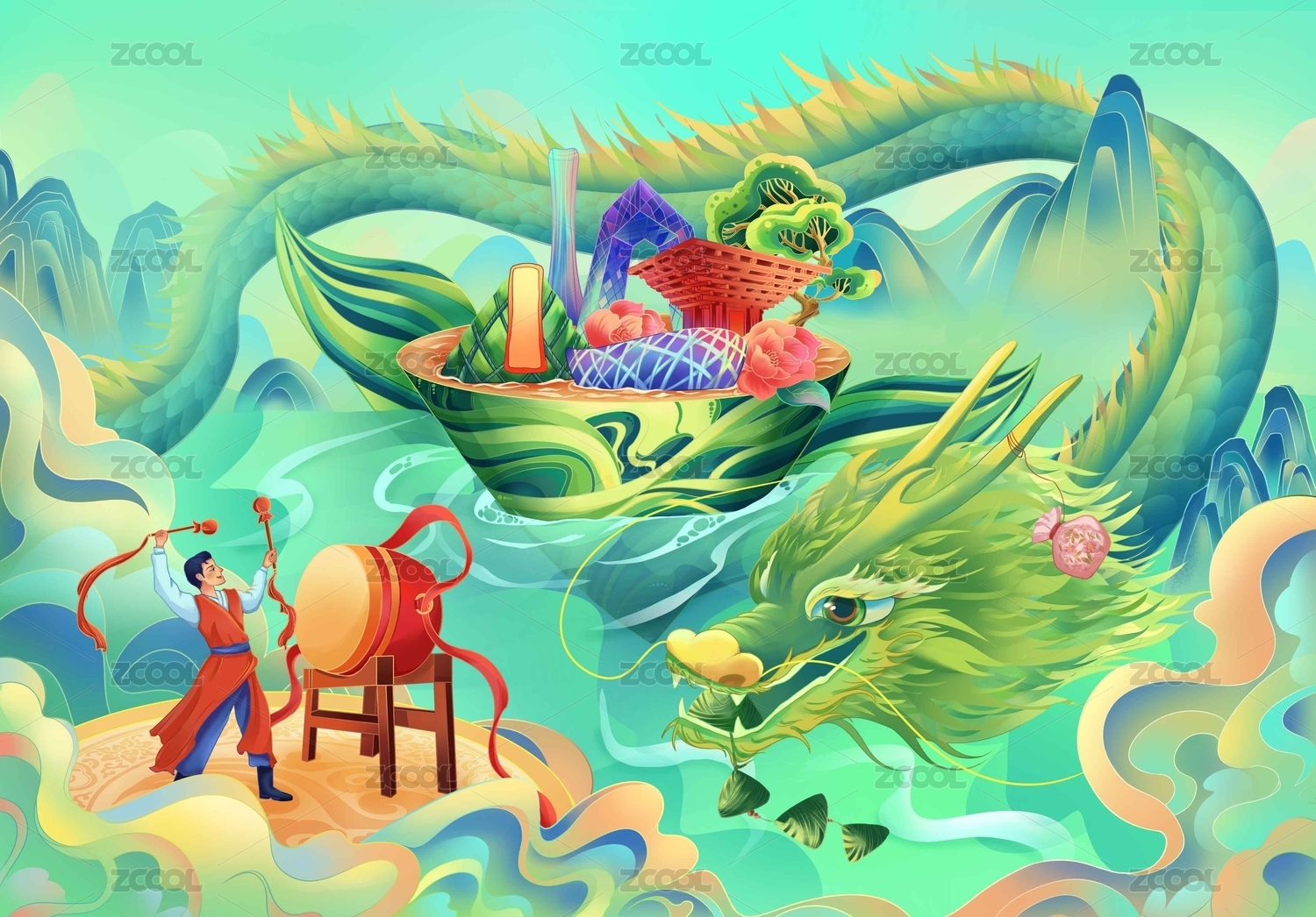 端午节中国风国潮插画青龙粽子建筑中国鼓