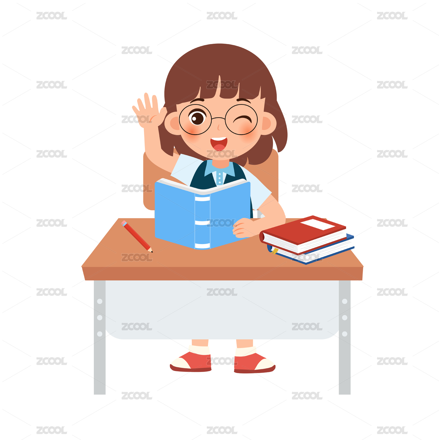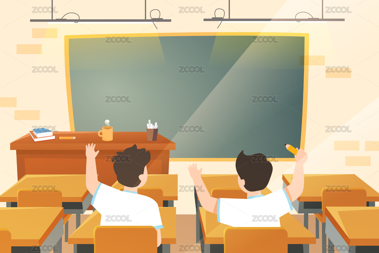 手绘插画 两位学生坐在书桌在写满公式的给办前举手加油