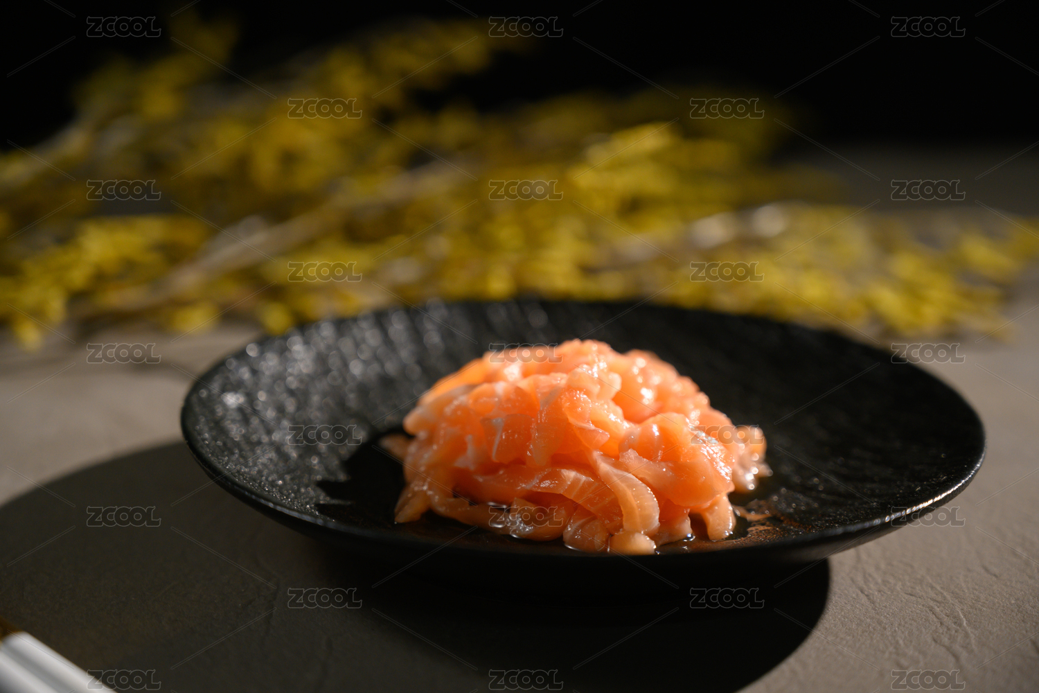 桌面上的盘子里的美味可口的三文鱼碎