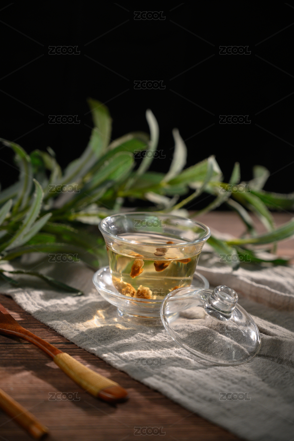 桌面上的杯子里的甘甜可口的金盏菊花茶