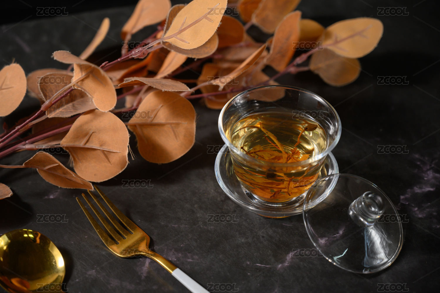 桌面上的杯子里的甘甜可口的金盏菊花茶
