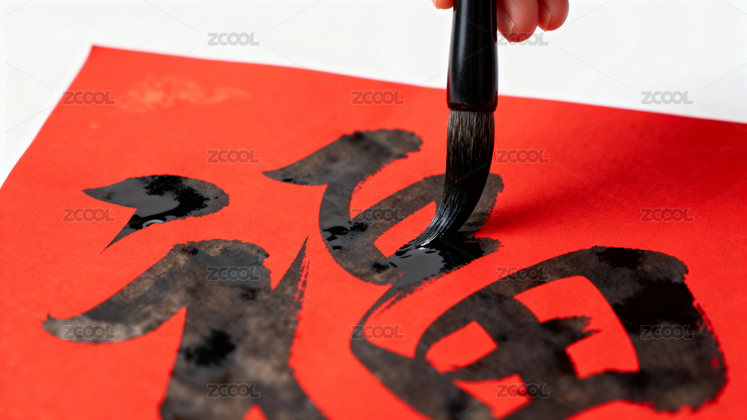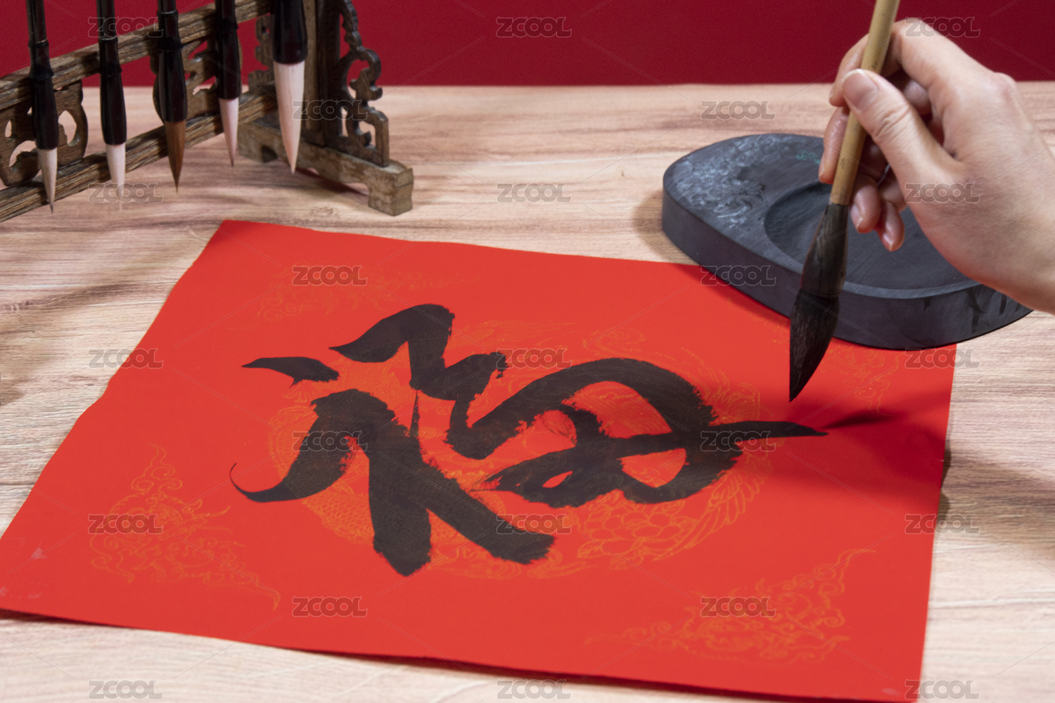 一个人,用毛笔在红纸上写福字