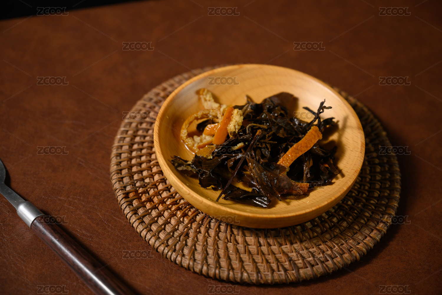 桌面上的盘子里的美味可口的陈皮白茶叶