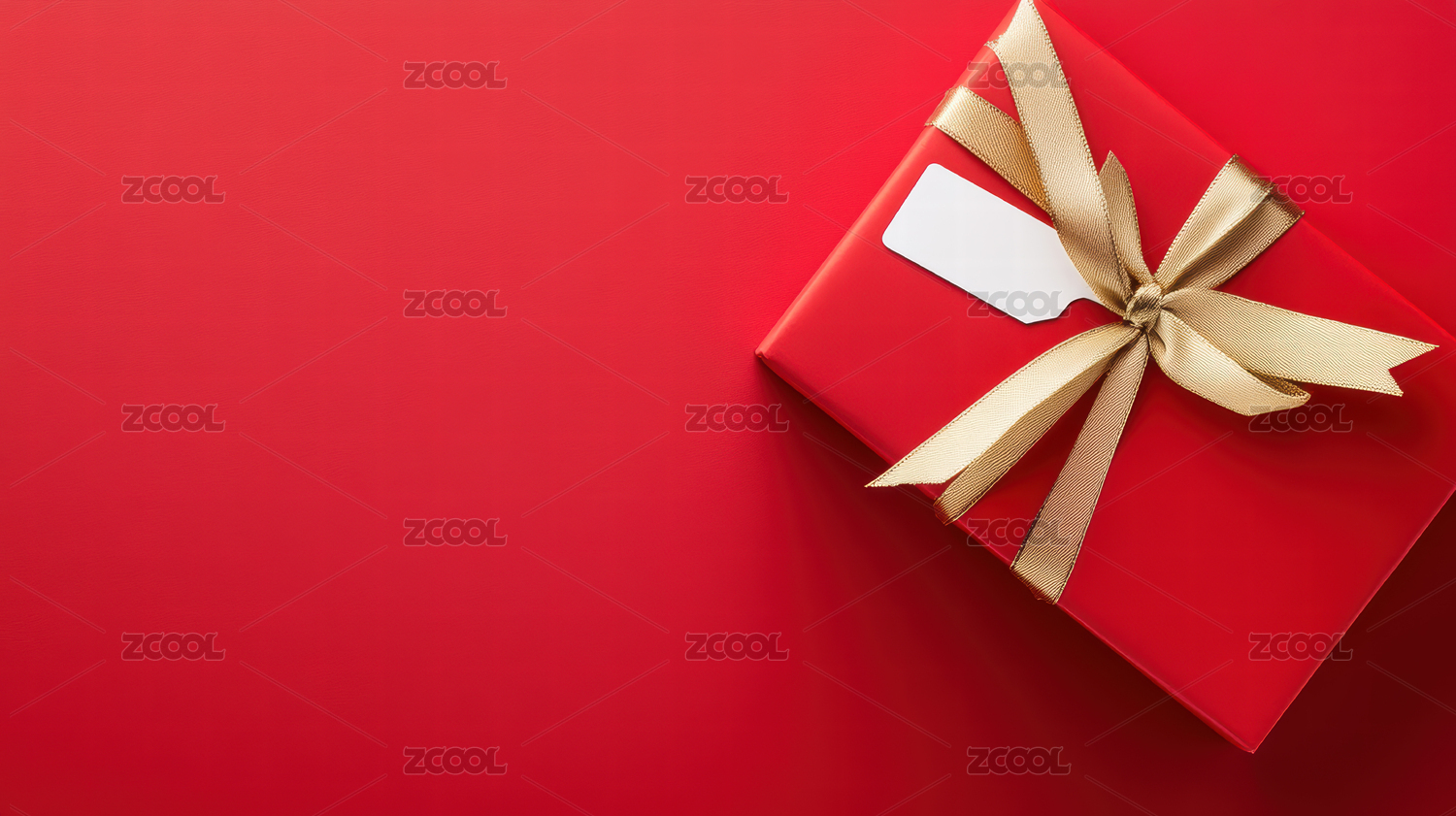 竖着放在红色背景的绑着香槟色带子的礼品盒