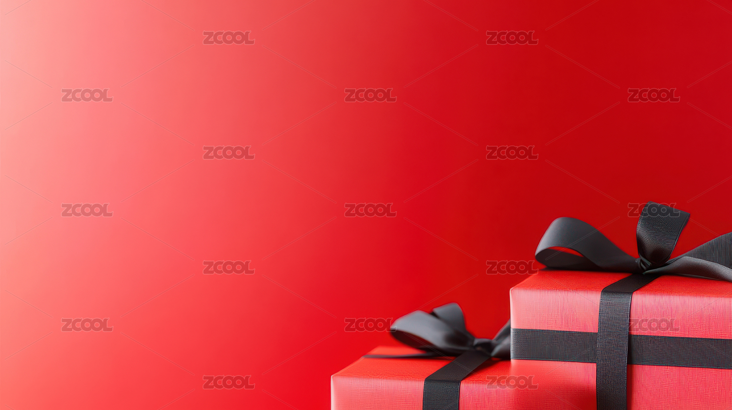 平放在红色背景的绑着香槟色带子的礼品盒局部