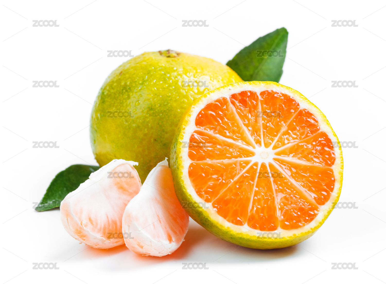 白底上一个完整的蜜桔和一个剥皮的蜜桔果肉