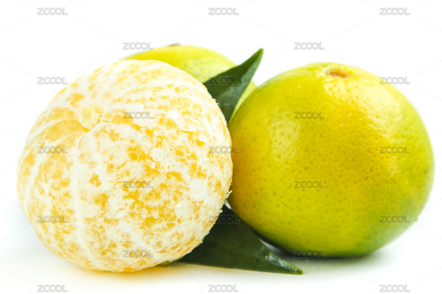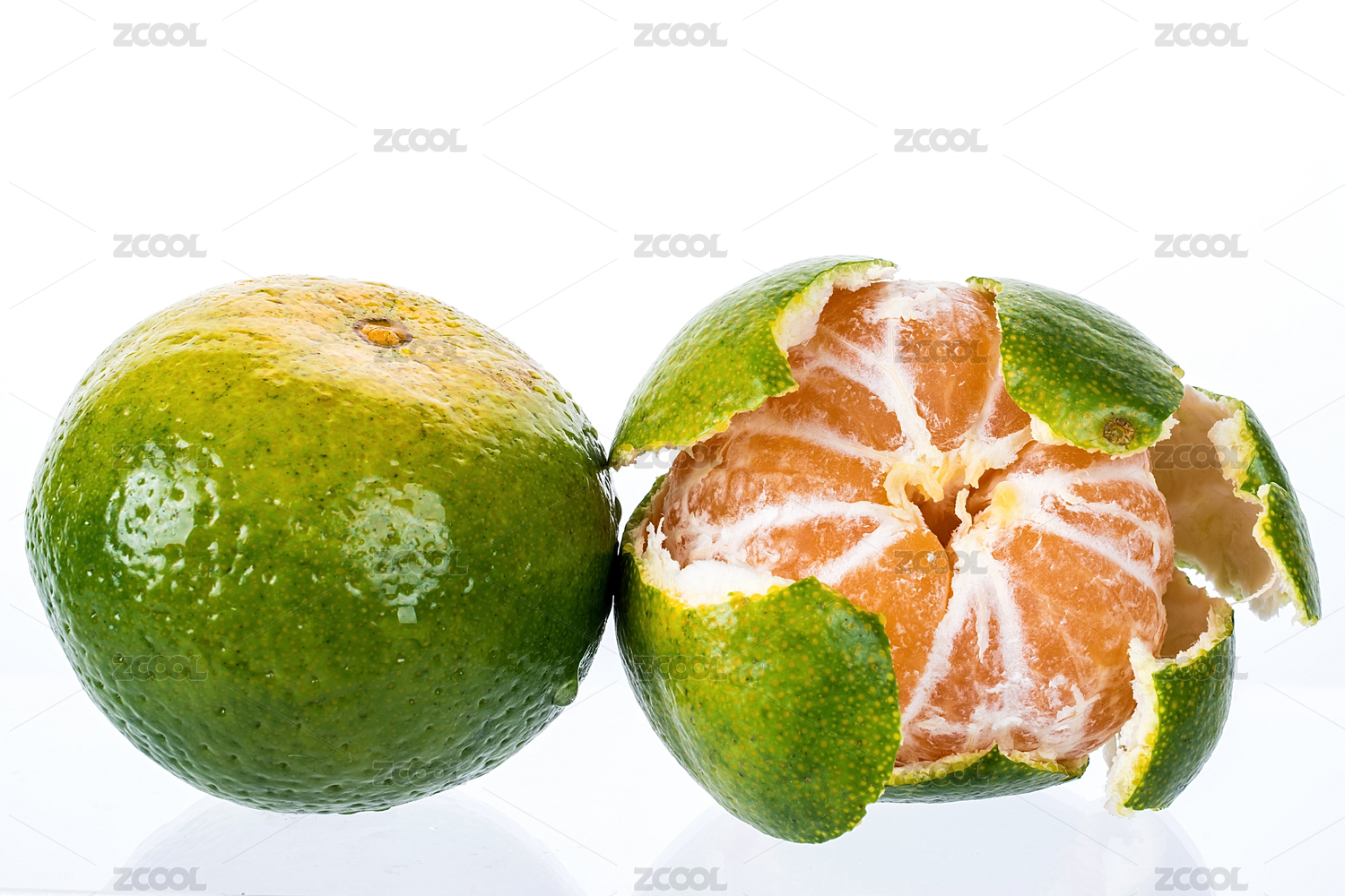白底上一个完整的蜜桔和一个剥皮的蜜桔果肉
